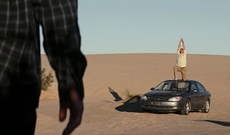 <초(민망한)능력자들> 중 사막 복판에서 태양을 영접 중인 조지 클루니. 요가 선생님에게 개인적으로 문의한 결과 ‘전사 자세’의 일종인 ‘비라바드라 원 아사나’로 판명됐다. 그나저나 클루니 덕분에 장차 이 자세를 취하며 고른 호흡을 유지하긴 글렀다.