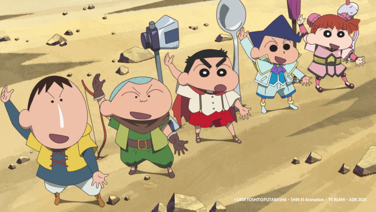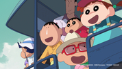 떡잎마을 어린이 엔터 페스티벌에서 우승한 떡잎마을 방범대 짱구, 맹구, 철수, 유리, 훈이는