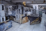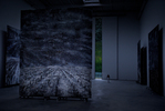 거대한 캔버스 위로 쏟아지는 납과 재, 그리고 모래가 빚어내는 강렬한 질감.