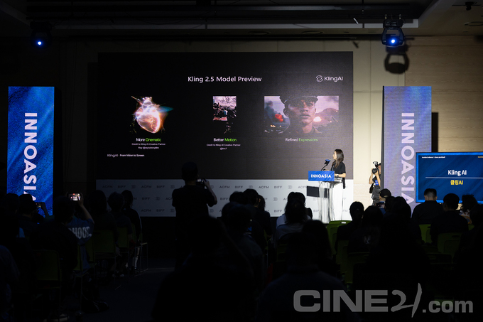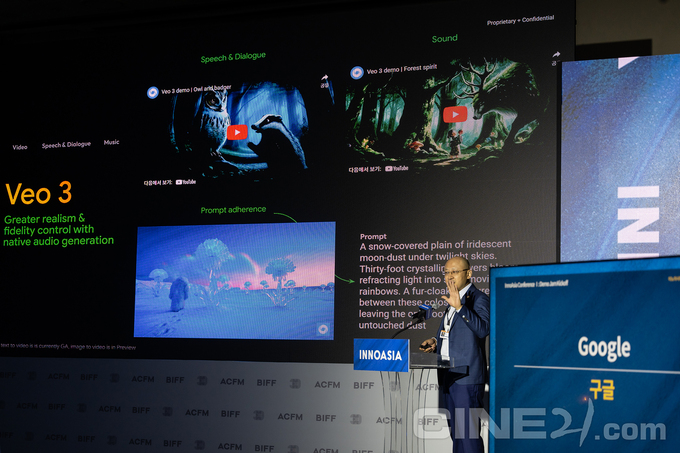 20일 10시30분부터는 이노아시아 프로그램의 시작인 ‘이노아시아 콘퍼런스 Ⅰ: 데모 잼 킥오프’가 개최됐다. ACFM에 참여한 빅테크 기업이 본인들의 화려한 이름과 기술을 선보이며 이후 ACFM에서 펼칠 프로그램을 소개하는 자리였다. 메가존클라우드, 구글클라우드, 미드저니, 클링AI, 바이트댄스의 드리미나AI, 픽스버스 등 세계의 생산형 AI 기업, 아마존웹서비스 등의 클라우딩 컴퓨터/데이터 서비스 업체가 참가했다. 레이 챈 구글 클라우드 북아시아 AI GTM 헤드는 구글의 신세대 이미지 생성 AI 모델 ‘나노바나나’와 'VEO3'를 소개하면서 지난 NBA(미국 프로 농구) 결승전 때 상영한 AI 영상의 제작비가 단돈 2,000만 달러라며 95% 수준의 비용 감축을 이뤘다고 설명했다. 이영은 아마존웹서비스(AWS) 코리아 수석 어카운트 매니저는 “AI는 결국 클라우드 위에서 작동하는 기술이므로 14년 넘게 세계 최정상의 클라우드 공급자 위치를 지키는 AWS의 중요성”을 강조했다.