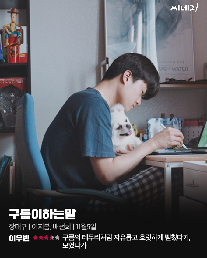 “노래하는 선희, 그림 그리는 준상 그리고 시를 쓰는 지봄.” 무척이나 가뿐한 영화의 시놉시스처럼, <구름이하는말>은 정말 구름의 자유로운 모양새를 이야기로 치환한 듯한 작품이다. 부산에 있는 작은 카페 ‘매일이다르다’에선 곧 2인조 밴드 ‘현수와 선희’의 작은 공연이 열릴 예정이다. 이에 준상(이시오)은 공연의 포스터를 그리게 되고, 선희(배선희)는 노래를 준비한다. 이 과정에 청중으로 참여했던 지봄(이지봄)은 선희의 곡에 가사를 붙이게 된다. 재개발로 인해 정든 집을 떠나야 하는 지봄에게 이 일은 꽤 기분 좋은 전환의 계기가 된다. 이렇게 창작의 맥락과 협업으로 자연스레 얽혀가는 많은 이의 모습이 차근차근 포개어진다. 가까운 곳에 사는 이들이 서로의 옷깃을 스치며 살짝 만났다가 헤어지고, 각자의 일상을 사는 느슨한 군상극이다. 여기엔 지나치게 예술 작업을 지나치게 우상화하는 과잉의 터치도 없고, 감정의 골을 억지로 뽑아내려는 드라마타이즈의 압박도 없다. <구름이하는말>엔 고양이가 아주 자주 등장한다. 화면을 가득 채우기도 하고, 카메라가 그들의 동선을 조심스레 기다리기도 한다. 민감한 고양이가 거부감 없이 프레임에 개입할 정도로, 등장인물들 역시 모종의 극적 거부감 없이 자연스러운 태도와 몸짓을 화면에 채워낸다. 비전문 배우를 주로 기용하며 다소간의 다큐멘터리적 시선을 극 안에 내포한 장태구 감독 특유의 스타일이 묻어난 대목이다. 또한 종래의 독립영화에서 보기 힘든 넉넉한 편집의 심상과 디졸브의 과감함도 영화의 자유로움을 키우는 감독 고유의 인장이다. 2024 전주국제영화제 지역 독립영화 쇼케이스 섹션에서 상영됐다.