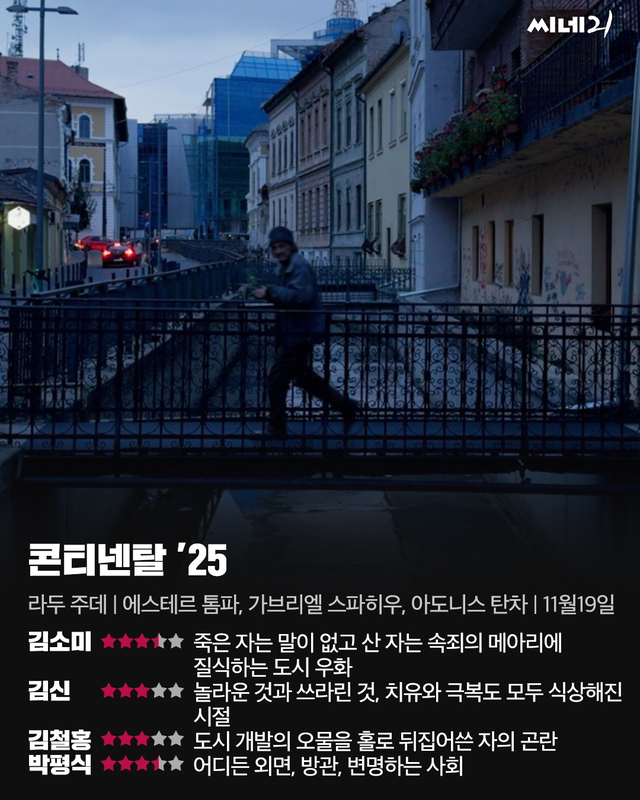 가슴 아픈 죽음에 관한 단 하나의 선명한 이미지를 딛고 이 말 많은 희비극은 결국 무력함의 한숨을 뱉어낸다. 라두 주데의 관심사는 애처로운 중간자의 정서적 깊이나 복잡성이 아니다. 냉엄한 리얼리즘은 그녀의 죄의식을 생생하게 품되 특유의 거리 두기로 위선을 포착하며 사회적 책임이 개인의 짐으로 남은 부조리를 감각게 한다. 신자유주의적 제도가 부추긴 개인의 양심적 파산에 관하여 <콘티넨탈 ’25>는 사실상 회생 불가 판정을 내린다. 도덕적 긴장감을 자아내는 장면과 몰입을 방해하는 코미디 사이, 정적인 프레임 안에 강렬하게 누적된 질문들은 관객들로 하여금 자신의 공모성과 씨름하게 만들 것이다. 루마니아의 국경을 넘어 우리 시대의 도덕적 투쟁을 비추는 거울 같은 영화가 등장했다. 잔인하게 우습고, 오래 얼얼하다.