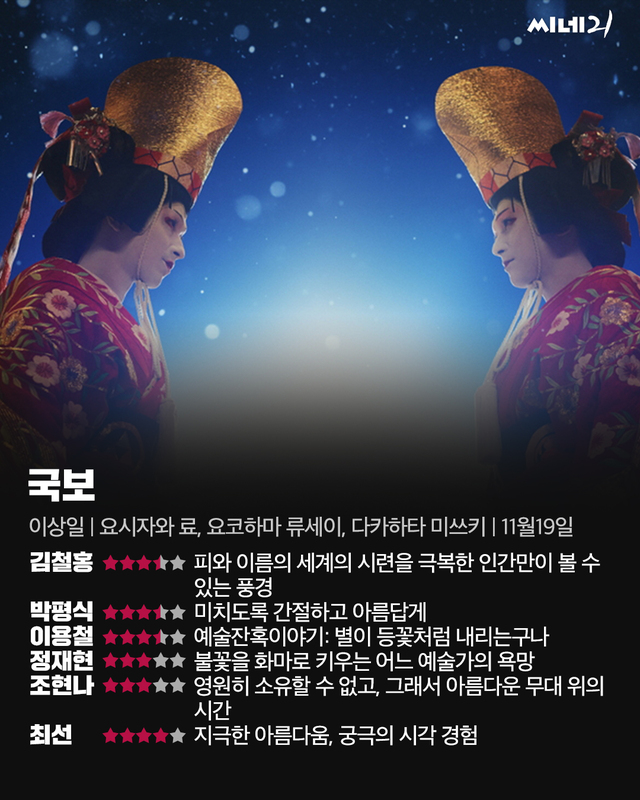 야쿠자 집안에서 태어난 키쿠오(구로카와 소야)는 아버지를 잃고 가부키 명문가에 거두어진다. 키쿠오는 명문 혈통을 이어받은 후계자 슌스케(요코하마 류세이)를 만나 함께 경쟁하고 우정을 나누며 배우로 성장한다. 재능을 인정받은 성인 키쿠오(요시자와 료)와 전통 계승의 무게를 짊어진 슌스케는 서로를 의식하며 국보의 길로 향하지만 승자와 패자로 나뉘어 그려지지 않는다. 경쟁을 다루면서도 누군가를 악인으로 만들지 않고 선악 구도에서 벗어나 예술 세계를 풀어내는 시선이 새롭고 인상적이다. 실사영화로는 이례적으로 일본에서 천만 관객 기록을 세운 이 영화는 극도의 절제가 만들어내는 압도적인 영상미로 아름다움의 끝을 보여준다. 서로를 잠식하지 않는 저마다의 생이 눈송이처럼 흩날려 지극한 아름다움을 이룬다.