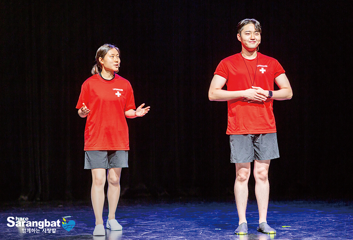 라이프 가드 티셔츠를 입은 남자와 여자. 스테이지블룸이 <드라이브 아웃 D(r)ive out>을 위해 무대에 갖춘 형상은 단출해 보인다. 하지만 윤지환, 이채린 배우가 들려준 스토리는 복잡다단했다. 그들이 관객을 데려간 장소는 한 시립 스포츠 센터의 수영장. 윤지환 배우가 연기한 연수는 계약직 안전요원이고, 이채린 배우가 연기한 기은은 ‘진상 민원인’으로 불리곤 하는 주민이다. 연수는 실적을 잘 쌓아 정규직으로 전환되기를 바란다. 무사고 수영장을 만들어 좋은 평가를 받는 것이 곧 그의 미션인 셈이다. 그런 연수의 속도 모르고 기은은 출입 금지 구역인 다이빙대를 몰래 드나든다. 이 연극은 두 사람의 갈등이 격화되는 과정에서 우리의 편견과 그로부터 비롯된 공격성의 위험을 드러냈다. 이 연극은 “꽃처럼 피워낸 예술로 삶을 위로하겠다”라는 스테이지블룸의 진심을 대변한 듯하다.