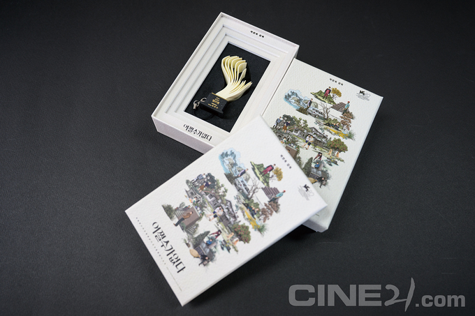 “<어쩔수가없다>는 개봉 전까지 보안이 아주 철저했던 작품이다. 영화를 보지 못한 것은 물론 줄거리도 파악하지 못한 채 작업해야 했다. ‘올해의 펄프맨상’ 트로피 모양의 키링을 만들어보자는 제안을 받았는데, 이 트로피가 영화에 어떤 맥락으로 등장하는지는 전혀 알 수 없었다! 그럼에도 납작한 평면으로는 트로피의 디테일을 보여줄 수 없겠다는 생각이 들더라. 금속이나 나무를 쓰는 방안 등 여러 가지 입체 제작 옵션을 떠올리다가 3D 모델링을 활용한 버전으로 발전시켰다. 트로피가 들어갈 박스 디자인도 고심했다. 관계자들에게 영화에 관한 힌트를 꼬치꼬치 묻다가 주인공 만수(이병헌)가 러시아의 마트료시카 인형처럼 여러 겹의 장갑을 꼈다가 벗는다는 이야기를 들었고, ‘순환’과 ‘반복’이라는 키워드를 얻었다. 덕분에 레이어가 많은 상자를 만들 수 있었다. 그 어느 때보다 많은 논의 끝에 완성한 굿즈라 각별하다.”