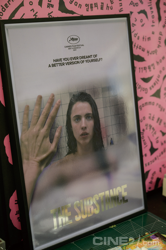 “CGV에는 영화를 본 관객에게 스페셜 굿즈 패키지를 증정하는 ‘디깅 타임’ 회차가 있었다. <서브스턴스> 개봉 당시에도 또각이 디깅 타임을 위한 소책자와 포스터를 만들었다. 이때는 다행히 미리 영화를 보고 작업할 수 있었다. 공포영화를 잘 못 보는 편이지만 몇번씩 반복 감상했다. 컨셉이 확실하고, 이미지가 다양한 작품인 만큼 그 강점을 굿즈로 잘 발전시켜보고 싶었기 때문이다. 책자 내지에 영화 속 요소들을 이것저것 넣을 수 있어 재밌었는데, 그 책자를 감싼 커버에도 공을 많이 들였다. 수(마거릿 퀄리)가 엘리자베스(데미 무어)의 등을 찢고 나오는 장면, 그 등을 꿰매는 장면이 특히 강렬하지 않나. 그 충격을 커버로 구현하고자 피부 같은 촉감의 스킨 코팅을 택했다. 후가공으로 구멍을 뚫고, 철사 느낌의 검은 끈까지 묶었다. 커버 하나를 위해서만 인쇄 업체, 타공 업체, 수작업 업체 등 거의 서너 군데를 거쳤다. 만만치 않았던 만큼 만족스러운 결과물이다.”