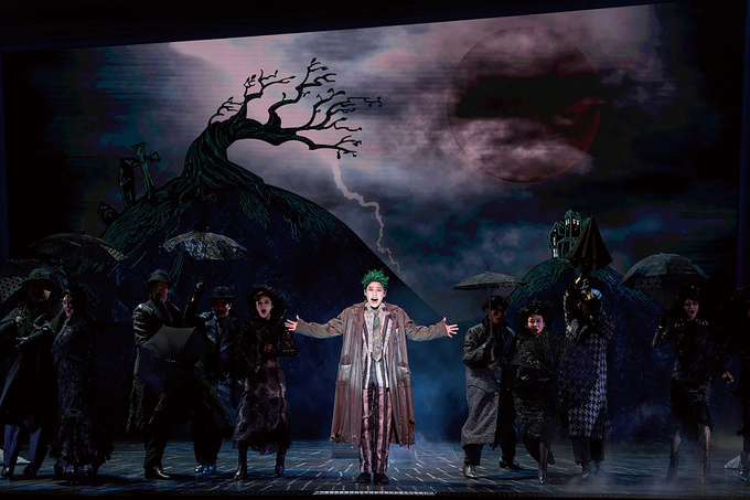 공연장 입장 줄에서 들은 대화 한 토막. 뮤지컬 <비틀쥬스>의 오브제로 가득한 극장 로비를 서성이던 한 관객이 동행한 지인에게 물었다. “나 아무것도 모르고 왔는데 이거 팀 버튼 원작이야?” 그의 질문처럼 팀 버튼은 미학의 일부만으로 세계의 전체를 짐작 가능한 감독이다. 영미권 관객은 팀 버튼 영화의 비주얼과 스토리를 두고 버트네스크(Burtonesque)라는 형용사를 만들 정도이니 말이다. 뮤지컬 <비틀쥬스>는 팀 버튼이 연출한 동명의 영화를 원작으로 만든 뮤지컬이다. 돌아보면 컴퓨터그래픽이 상용화되기 이전에 제작된 원작 영화는 실물 세트와 다양한 소품으로 스펙터클을 만들었다는 점에서 일견 무대극과 닮아 있다. 이 특성을 뮤지컬 또한 더없이 어울리게 계승했다. 아날로그적 특수효과와 소품은 물론 뒤틀린 채 소용돌이치는 곡선, 음산한 컬러로 채색된 고딕스타일의 세트 등 우리에게 익숙한 팀 버튼식 미장센이 무대에 가득하다. 뮤지컬 <비틀쥬스>는 영화와 비슷한 줄거리를 공유한다. 어머니를 여읜 고스족 소녀 리디아는 새로 이사한 집에서 부부 유령 애덤과 바버라를 보고, 이들 부부와 어울리다 악령 비틀쥬스를 소환한다. 비틀쥬스는 리디아를 향한 음흉한 계획을 세우지만 리디아는 이승과 저승을 오가는 모험 속에서도 비틀쥬스에게 쉽게 속아 넘어가지 않는다. 여러모로 버트네스크한 뮤지컬 <비틀쥬스>는 와중에 20세기에 만들어진 영화가 놓쳤을 법한 정치사회적 감수성을 동시대 관객이 즐길 만한 방식으로 업데이트했다. <Banana Boat(Day-O)>나 <Jump In the Line>같이 영화가 아이코닉하게 사용한 해리 벨라폰테의 팝 역시 원작의 유머를 잇되 무대만의 맹점을 살리는 방식으로 재편곡했다.