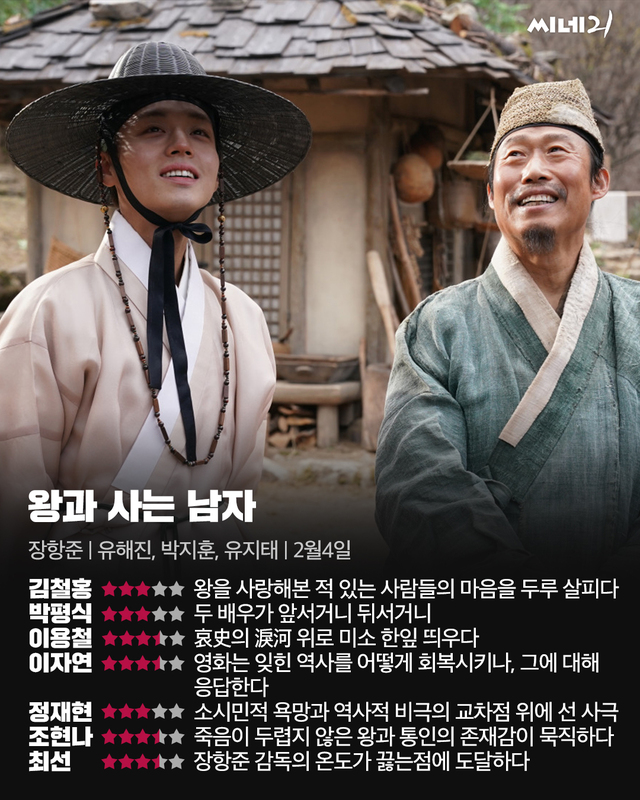 1453년 조선. 단종 이홍위(박지훈)는 숙부의 정치 반란으로 왕위를 잃고, 한명회(유지태)의 책모로 유배에 처해진다. 유배지는 강원도 영월 광천골. 이곳의 촌장 엄흥도(유해진)는 정치 폭력의 피해자인 상왕이 유배를 와 골머리를 앓는다. <왕과 사는 남자>는 전인미답의 길을 걷는 사극이다. 세조와 한명회의 쿠데타 획책, 이후 벌어진 사육신의 단종 복위 운동 등 정쟁의 묘사는 영화의 주목 대상이 아니다. 대신 <왕과 사는 남자>는 폐위 이후 실존을 고뇌하는 어린 왕의 비애, 그리고 그를 보필하는 광천골 민초들의 삶을 공들여 그린다. 엄흥도는 유배지 유치를 통해 촌민들에게 쌀밥으로 대표되는 입신양명의 기회를 제공하려 애쓰고, 촌민들은 반상제도가 유발하는 박탈감을 회피하지 않으면서도 연대와 협동 등의 공동체 가치를 왕족과 공유한다. 그렇게 <왕과 사는 남자>는 소시민적 욕망과 정변 사이의 교차점을 파고들며 흥미로운 사관(史觀)을 제시한다.
