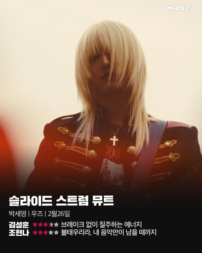 오디션에 떨어진 우진(우즈) 앞에 남루한 차림새의 남기(저스틴 H. 민)가 나타난다. 처참히 망가진 기타도 수리 가능하다는 ‘해피 기타’의 소문을 들었다며 그는 조각 난 기타를 우진에게 건넨다. 홀린 듯 기타를 수리하고 연주한 우진은 전에 없던 음악적 재능을 거머쥔다. 그러나 연주를 거듭할수록 그의 몸은 기타의 저주에 잠식되기 시작한다. 박세영 감독이 연출한 <슬라이드 스트럼 뮤트>는 뮤지션 우즈(WOODZ)가 첫 정규앨범 발표를 앞두고 꾀한 세계관 확장과 맞닿아 있다. 우즈가 쓴 원안에 박세영 감독, 오유경 작가가 살을 붙여 완성한 작품으로 주인공 우진으로 분한 우즈, 그와 대적하는 배우 저스틴 H. 민, 영화의 시작과 끝을 책임지는 정회린 배우가 조화롭게 합을 맞춘다. 우진의 변화가 고스란히 드러나는 공연 신들과 기타의 생명력을 구현한 몽타주가 인상적으로 연출됐으며 박세영 감독과 우즈의 이면을 확인할 수 있는 작품이다.