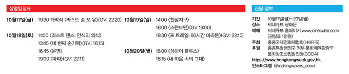 아름다운 네온사인과 마천루의 황홀경, 소시민의 소박한 일상과 선명한 색감의 이미지들. 홍콩영화가 각인한 영화적 DNA란 이런 것이다. 상하이, 광저우, 우한, 방콕을 지나 2025년 서울 개최를 앞둔 ‘홍콩위크’는 홍콩특별행정구 정부 여가문화서비스부의 주최로 홍콩의 문화적 매력과 예술적 다양성을 선보이는 큼직한 행사다. 9월26일 개막 이후 10월25일까지 한달여 진행되는 동안 무용·음악·중국 명화·애니메이션·패션 디자인 등 총 14개 프로그램이 관객을 반길 것이다. 특히 10월17일부터 20일까지 나흘 동안 홍콩 고유의 정서와 풍경, 시대정신과 문화적 트렌드, 동시대적 서사와 감정을 경험할 수 있는 영화제인 ‘메이킹 웨이브즈: 홍콩영화의 새로운 물결’이 이어진다. 개막작 <라스트 송 포 유>를 시작으로 홍콩 클래식의 대명사 <천장지구><상하이 블루스>가 오랜만에 스크린에 오르고, 홍콩영화 역대 흥행 순위 1위를 기록한 <라스트 댄스: 안식의 의식>, 홍콩금상장영화제 신인감독상에 빛나는 <포 트레일: 60시간 마라톤>, 정바오루이 감독의 장르성이 돋보이는 <운명>등 총 10개 작품이 마련돼 있다. 영화제는 씨네큐브 광화문에서 진행될 예정이다. 홍콩 감성을 사랑하는 자, 이제 새로운 물결을 즐길 시간이다.