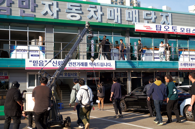 영화의 초반부, 서울경찰청 강력범죄수사대(이하 강수대) 에이스 형사인 미선은 마약 거래 정황을 제보받고 팀장 상웅(정만식)과 함께 중고차 매매단지를 급습한다. 평범한 중고차 시장처럼 보이는 일상적 공간이 실은 마약범죄에 활용되고 있다는 설정은 <크로스>의 핵심을 관통한다. 감만 자동차매매단지에서 촬영된 수사 장면은 “미선이 강수대 에이스로서 활동적이며 유능한 면모를 보여주는 중요한 포인트”(이나겸 미술감독)였다. 앞으로 펼쳐질 액션의 톤 앤드 매너를 예고하는 중요한 시퀀스에서 “다른 중고차 매매단지보다 넓고 평지인 데다 야외에 쫙 펼쳐진 중고차 행렬이 주는 광활한 이미지”(유춘수 제작실장)를 갖춘 감만 자동차매매단지는 호쾌한 액션의 장이 되기에 충분했다. 박정훈 촬영감독은 바다를 인접하고 있다는 특장점을 언급하며 “고가 다리와 넓은 바다가 화각에 걸리는 인상적인 풍경” 속에서 경쾌하고 시원한 액션 장면을 확보할 수 있었다고 설명했다.