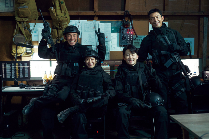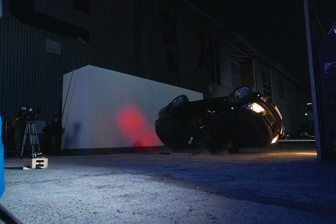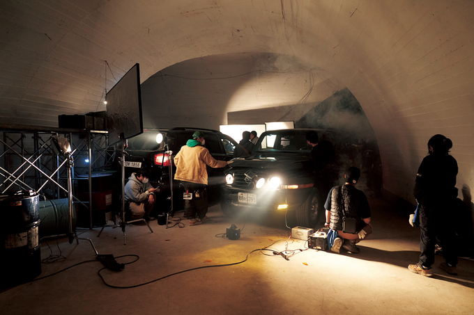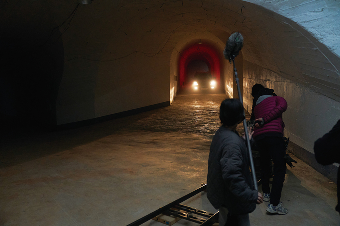 처음으로 충무시설에서 이뤄진 시도였던 만큼 의외의 상황도 발생했다. 유춘수 제작실장은 “산속에 있던 시설이라 흙먼지가 엄청 많았다. 차량을 운행하면 먼지가 너무 날려 물차를 동원해 제작팀과 함께 며칠을 쓸고 닦고 했다”며 당시를 추억했다. 추월이 불가능할 정도로 좁은 도로폭을 활용하기 위해 촬영팀은 묘수를 내기도 했다. “기존의 추격 신처럼 장비나 다른 슈팅카가 들어갈 수 없는 폭이어서 경차에 카메라를 달고 찍었다. 무술팀의 운전이 정말 중요했던 장면이다.”(박정훈 촬영감독) 그렇게 건진 좁디좁은 터널 속 카체이스 신은 거대 악에 맞선 부부의 비현실적인 첩보 공간과 그들의 현실 사이를 잇는 중요한 메타포로 활용됐다.