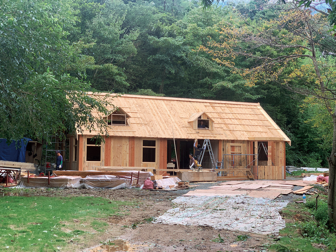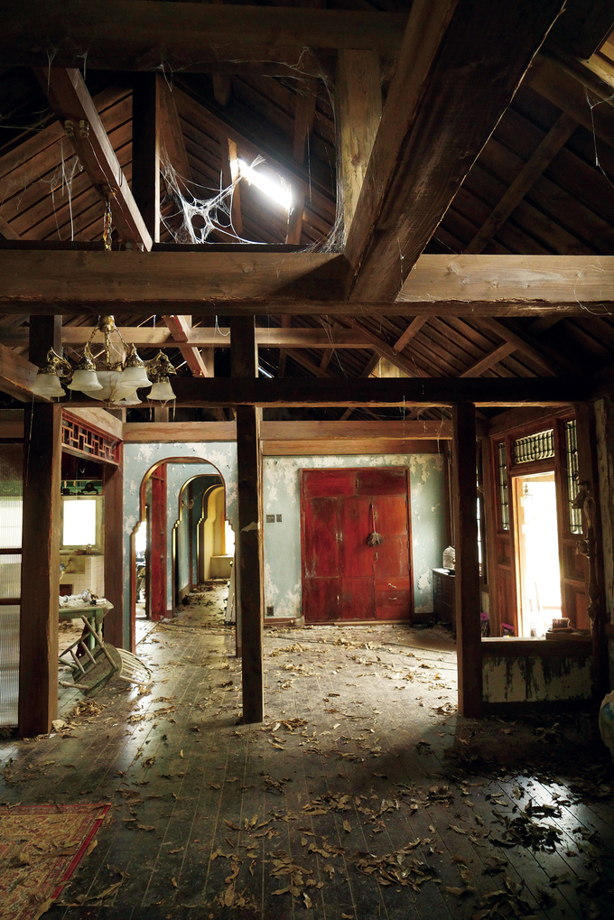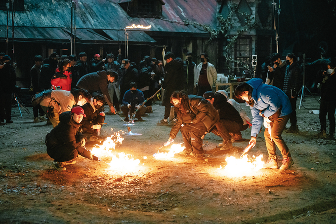 ‘베이커 ㅅㅂ의 집.’ 현판의 글씨조차 바래 엄한 욕설로 읽히는 이 집의 최초 입주자는 한국전쟁 이후 선교를 목적으로 한국을 방문한 베이커 신부(제이미 호런)다. 남동협 감독과 정이진 미술감독은 과거에 악령이 출몰해 폐가가 된 서양식 주택을 축조했다. “미국적인 디자인의 주택이 우리나라에 있으려면 어떤 설정이 가장 자연스러울지 고민했다. 한국에 그런 집이 존재하는 게 어렵지 않나. 조사해보니 1950년대에 선교 활동을 하던 신부님들의 사택이 있었다고 한다. 그들이 편히 지낼 법한 구조의 사택이 전국에 많았다. 산장이 본래 선교사의 사택이라고 설정하면 공간이 존재의 당위성을 확보할 수 있을 것 같았다.” 부엌엔 가마솥과 아궁이가, 주방엔 한국식 타일이 붙어 있는 언밸런스는 상상력이 보태진 결과다. “당시 사택을 지을 때 한국의 목수들은 정확한 이미지를 토대로 짓지 않았을 것이다. 그러니 외형은 얼추 서구식이어도 내부로 들어오면 다분히 한국적인 물품들로 채워져 있지 않았을까.”(남동협 감독)