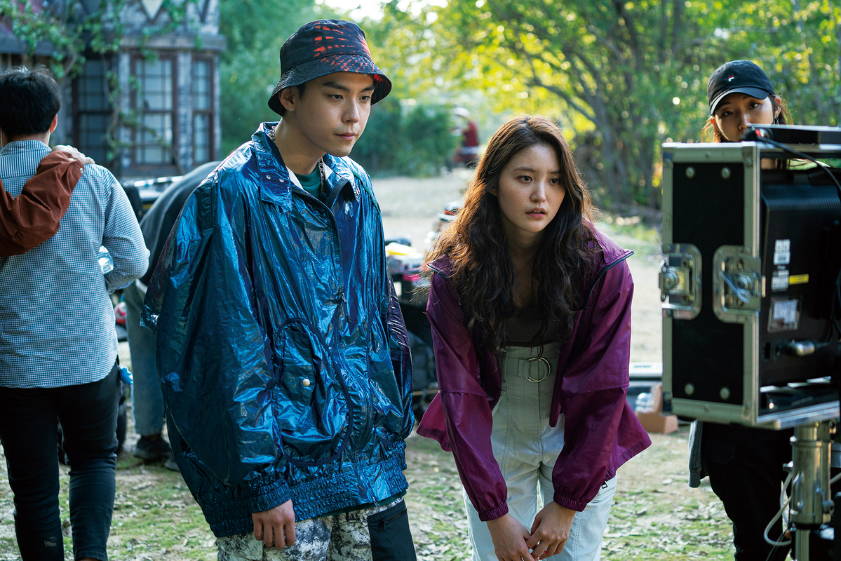“소위 B무비라고 하는, B급 정서의 작품을 만들기 위해선 CG 사용을 지양해야 했다. 꼭 그래픽이 필요한 장면이 아니라면 아날로그의 느낌을 살리는 편을 택했다.” 남동협 감독이 <핸섬가이즈>만의 독특한 오락성을 만들기 위해 택한 전략이다. 이를테면 <핸섬가이즈>에서 ‘신들린’ 대상은 오컬트영화에 자주 등장하는 가축인 염소다. 염소의 형상을 한 수많은 악마의 이미지를 결합시켜 극 중 염소 악령 바포메트가 탄생했다. 이때 약재이자 보양식으로도 취급되는 흑염소가 악의 숙주라는 점도 <핸섬가이즈>답다. 무덤에서 염소의 발이 튀어나오는 점프스케어를 찍을 땐 CG로 염소의 발을 그리기보다 직접 스태프가 땅을 파고 무덤 속에 들어가(여기서부터 수작업이다) 신호에 맞춰 더미로 만든 염소의 발을 땅 밖으로 들어올렸다. 제이슨을 연기한 김도훈 배우는 배역의 최후를 연기하기 위해 목재 분쇄기 안으로 직접 뛰어들었다. 제작진은 배우가 직접 스턴트를 소화하는 장면을 완성도 있게 연출하기 위해 안전에 만전을 기했다. 분쇄기 입구에 스티로폼을 매설해 배우가 추락해도 다치지 않도록 준비해두었다고 한다.