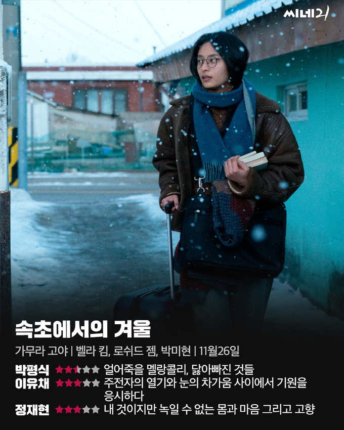 겨울 속초의 게스트 하우스. 이곳을 살뜰히 돌보는 건 20대 매니저 수하(벨라 킴)다. 어떤 손님에게도 태연하던 그가 프랑스인 숙박객 케랑(로쉬디 젬) 앞에서는 감정이 격랑한다. 추운 계절에 더없이 어울리는 영화가 찾아왔다. <속초에서의 겨울>은 쌓인 눈과 두툼한 코트, 시린 입김과 뜨거운 주전자의 열기까지 시청각적으로 겨울의 감각을 오롯이 끌어올린다. 프랑스인 아버지와 한국인 어머니를 둔 수하가 케랑을 탐색하며 자기 뿌리를 더듬어가는 과정은 천천히 내리는 눈처럼 부드럽게 내려앉아 오래 남는다. 프랑스계 일본인 감독 가무라 고야를 비롯해 촬영과 음악 등 다국적 스태프가 참여해 이국적 분위기도 물씬 풍긴다. <기생충>이 외국어영화상을 받은 바 있는 프랑스 세자르영화제에서 벨라 킴이 한국인 최초로 신인여배우상 후보에 오른 소식이 작품에 대한 기대감을 더한다.