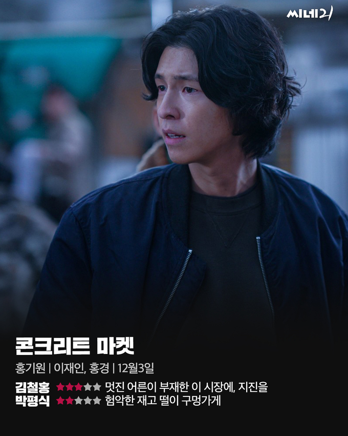 대지진으로 폐허가 된 세상에 유일하게 무너지지 않은 아파트가 있다. 생존자들은 아파트 앞마당에 형성된 ‘황궁마켓’에서 통조림을 화폐 삼아 생필품을 거래하며 삶을 이어가고 있다. 그곳의 관리자인 상용(정만식)은 뛰어난 사업 수완과 카리스마를 바탕으로 혼란스러운 세상의 질서를 세우는 중이다. 어느 날 황궁마켓에 외부인 희로(이재인)가 등장한다. 희로는 상용의 오른팔인 태진(홍경)의 통조림을 훔치며 그 존재감을 드러내지만 실은 또 다른 목적이 있는 것처럼 보인다. 희로는 또 한명의 중간 관리자인 철민(유수빈)에게까지 접근하여 마켓 내의 권력관계를 뒤흔든다. 한정된 자원의 수요와 공급 논리를 활용해 경제권까지 확보한 희로는 이제 상용이 저질렀던 만행을 밝히려 나선다. <콘크리트 마켓>은 대지진이 일어난 디스토피아적 세계관을 바탕으로 진행되는 재난 장르물이다. 주요 배경인 시장을 중심으로 사건이 진행되는만큼 자연스레 몸의 액션보다는 인물들의 대사와 주인공이 펼치는 계략에 주목하게 된다. 극이 가진 매력의 상당 부분은 희로를 연기한 이재인 배우가 이끌어간다. 왜소한 체격의 희로는 외양만 봤을 땐 재난 상황에서 살아남기 힘들 것으로 느껴지는 캐릭터이지만, 경제 지식을 적재적소에 활용하는 방식으로 자신보다 힘이 센 남성 어른들과 생존 경쟁을 펼친다. <콘크리트 마켓>은 홍경, 유수빈 등 개성 강한 젊은 배우들로 구성된 주요 캐스팅 등을 바탕으로 기존 장르영화의 관습을 기분 좋게 비튼다. 핸드헬드 촬영으로 담긴 그레이 톤의 화면과 대담한 텍스트 타이틀 활용 또한 인상적이다.