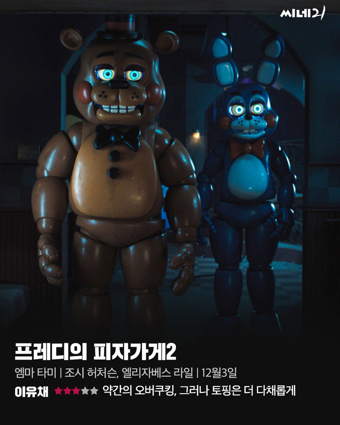 2023년 개봉 당시 북미 박스오피스를 놀라게 한 블룸하우스 공포영화 <프레디의 피자가게>가 후속편으로 돌아왔다. <프레디의 피자가게2>는 전편에서 살아남은 경비원 마이크(조시 허처슨)와 그의 어린 여동생 애비(파이퍼 루비오), 연인인 경찰관 바네사(엘리자베스 라일)가 피자가게에서 일어난 사건 이후 삶을 재건해나가는 과정을 따라간다. 이번 편에 새롭게 등장하는 마리오네트를 비롯한 애니메트로닉스는 더 거대해지고 재빠르며 교활해졌다. 귀여운 외형이 무서워 보일 만큼 기발한 점프스퀘어가 공포영화의 재미를 만든다. 특유의 놀이공원 같은 분위기가 살아 있으나 인물들의 회복과 치유에 초점을 맞추면서 극적 긴장감이 옅어졌다.