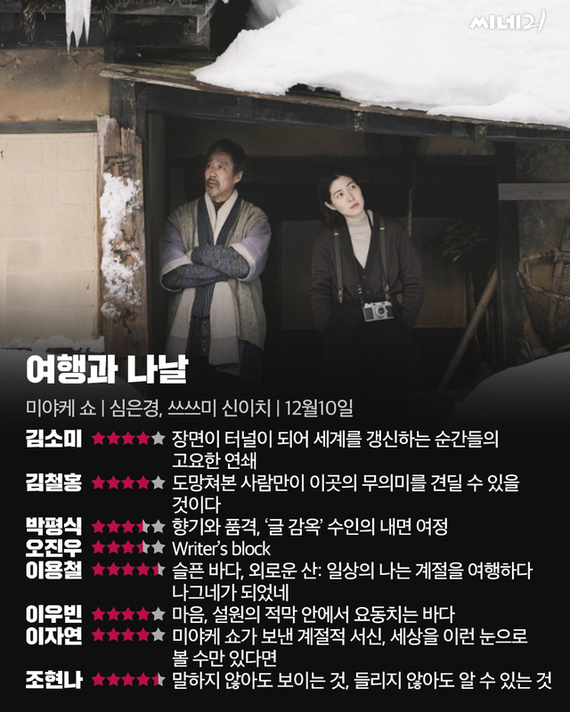 텅 빈 여관. 가만히 앉아서 연필로 글을 쓰는 여자. 그가 쓰는 것은 바로 영화 각본이다. 슬럼프에 빠진 각본가 이(심은경)는 과거의 여행을 기억하며 빈 페이지를 채워나간다. 쓰게 요시하루의 만화 <해변의 서경><눈집의 벤씨>를 원작으로 한 <여행과 나날>은 영화 속 영화라는 액자식구성으로 이뤄져 있다. 어느 여름날, 인적 드문 바닷가에 나온 도시 여자 나기사(가와이 유미)는 어머니의 고향을 찾은 나츠오(다카다 만사쿠)를 우연히 만난다. 이들은 발끝도 닿기 어려운 심해에서 얼굴만 동동 띄운 채 의미 없는 대화를 나눈다. 꿈속 같기도 낮잠 같기도 한 <여행과 나날>은 겨울 속에 선 이의 모습과 여름을 채운 두 남녀의 모습으로 잔잔한 소동을 그린다. 여행의 비일상은 어떻게 언어화되는가. 아름다운 촬영과 심은경의 담백한 연기가 아름답게 뒤섞인다.