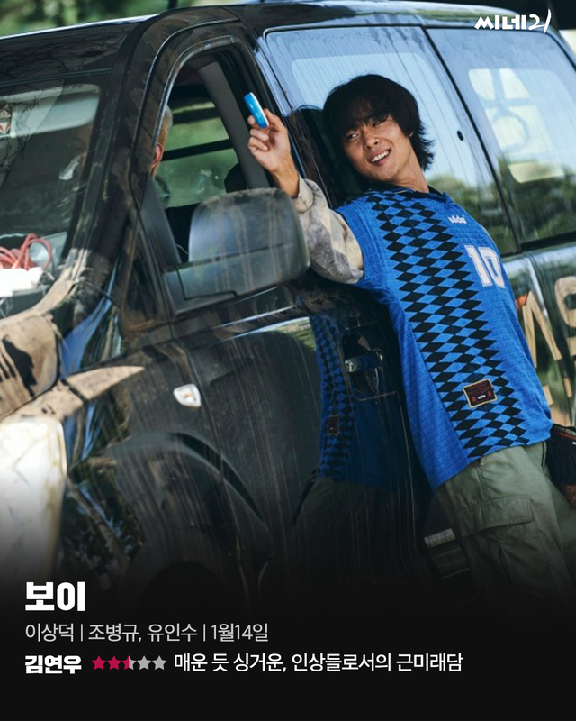 근미래, 정부의 정책 실패로 인해 생긴 ‘잉여’ 인구들이 가상의 도시 포구에 위치한 텍사스 온천에 모여든다. 엄마를 찾아온 제인(지니)도 그중 하나다. 온천의 운영자는 교한(유인수)과 동생 로한(조병규)으로, 형제는 미스터리한 인물 모자장수(서인국)에게 복종한다. 서로 적대하던 것도 잠시, 유일한 가족과 유해하게 얽힌 로한과 제인은 점차 가까워진다. 그러나 곧 제인의 엄마가 약물 과다 복용으로 사망하고 제인은 교한의 골칫거리가 된다. 교한은 로한을, 로한은 제인을 지키기 위해 움직인다. <보이>를 한 가지 방식으로 설명하면, 각자의 ‘지킴’이 자기중심적 착각일 수도 있음을 형제가 깨닫는 과정이다. 이상덕 감독의 세 번째 장편으로 장르가 다른 만큼 톤과 템포만은 전작들과 차별된다. 청년층이 MP3와 2G 폰을 휴대하는 <보이>의 세계는 꼭 2000~2010년 무렵의 감성으로 하나의 근미래 이미지를 상상한 결과물처럼 다가온다. 다양한 이들이 머물며 각종 물질과 행위에 중독되는 텍사스 온천은 약속과 규칙보다 폭언과 구타가 먼저 통하는 디스토피아다. 반복해 들리는 구호 ‘사람은 힘이다’는 사람이 쓰고 버리는 물건 취급됨을 역설적으로 드러낸다. 그러나 주민들의 생계유지 방법이나 다들 갈구하는 ‘티켓’으로 입장한 곳의 정체 등은 인상으로만 주어진다. 여러 장르의 팝 리듬으로 재생되는 장면들은 뮤직비디오를 연이어 시청하는 감각을 낳는다. 플롯과 정서적 설득력이 그다지 촘촘하지 않지만, 어쩌면 <보이>가 집중해 담는 바는- 일상에 스민 종말을 체감하며 놀이 수행의 태도로 버티는 소년- 로한의 요동치는 상태 자체다. 다만 기시감이 드는 그 스타일링에 대한 반응은 취향에 따라 갈릴 것으로 보인다.