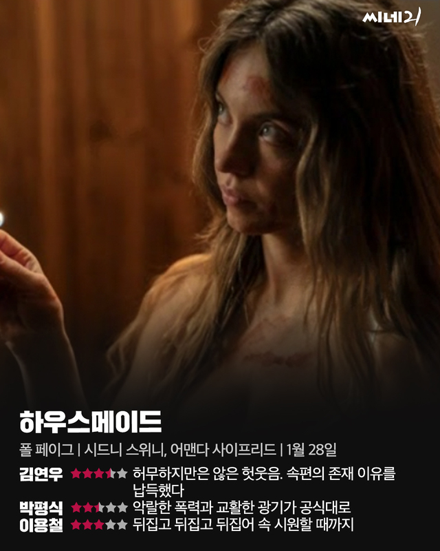 <하우스메이드>는 프리다 맥패든의 3부작 소설 중 첫 번째 권을 영화화한 작품이다. 일인칭시점으로 상세히 묘사한 원작의 방식을 압축해 영화 고유의 분위기로 구현했다. 처음부터 충격을 가한 후 아슬아슬한 긴장을 유지하되, 끊임없이 몰아치기보단 자극의 강도와 종류를 조절하고 변주하며 진행하는 편이다. 스릴러의 톤을 저변에 깔고 서사의 굴절과 함께 여러 장르를 덧입힌다. 로맨스, 약간의 고어, 일종의 안티히어로 탄생기도 섞인다. 후반부는 원작을 과감히 축약하고 새로운 장면들을 추가해, 관람의 심리적 압박을 덜어내고 시청각적 충격을 더하는 방향으로 각색됐다. 전개가 다소 급하다는 인상을 주지만 나름의 선택과 집중으로 보인다. 영화가 플롯을 비트는 방식도 눈여겨볼 만하다. 전반부의 단서들을 통해 반전의 내용을 어느 정도 짐작하더라도, 관점이 전환되는 순간의 연기와 연출 디테일, 전후의 장면 구성, 회수되는 복선들을 지켜보는 재미가 충분하다. 무엇보다 이 서사 배치 순서에 담긴 의도가 서프라이즈에 국한되지 않는다는 점에 의미가 있다. 놀라움을 기대하거나 따져 분석하기보단 영화의 템포에 몸을 맡길 때 더 효과적으로 (불)쾌감을 느낄 만한 작품이다. 덧붙여 니나의 ‘비밀’이 현실과 동떨어져 있지 않기에, 경우에 따라서는 미리 알고 보는 편이 나을 것이다.