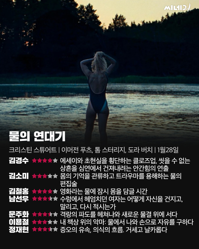 한 여자가 수영장 레일 앞에 서 있다. 관객은 물에 비쳐 흔들리는 이미지로 그를 처음 만난다. 수중에 뛰어든 그에게서 흐르는 피를, 카메라는 타일 가까이 다가가 찍는다. 우리에게 배우로 익숙한 감독 크리스틴 스튜어트는 첫 장편 연출작 <물의 연대기>에서 이처럼 관객과 인물 사이에 일정한 거리를 확보하되, 에두르지 않는 화법으로 한 인간의 삶을 회고한다.