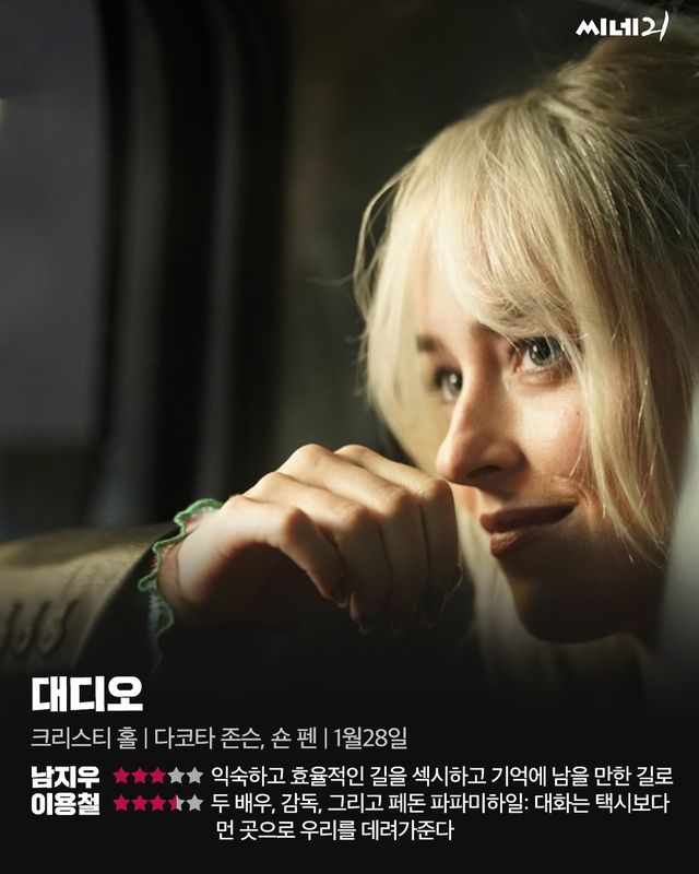 존 F. 케네디 국제공항에서 뉴욕 도심으로 들어가는 사람들. 무거운 캐리어를 끌고 대중교통의 불확실성과 싸우는 대신 맨해튼행 정찰제 택시를 타는 이유가 있다. 고향 오클라호마와 직장이 있는 뉴욕을 수없이 오갔을 프로그래머 주인공(다코타 존슨)에게 택시는 자연스럽게 체화해온 효율적인 선택이었을 터. 하지만 영화 <대디오>는 그녀에게 기사 클라크(숀 펜)를 배정하며, 익숙한 귀갓길을 기억에 남을 만한 여정으로 만든다. 밀폐된 택시 안에서 남성 기사와 여성 승객이 나누는 섹스 토크를 현실에서 상상하기엔 쉽지 않다. 하지만 영화는 섹스를 경유해야만 닿을 수 있는 비선형적 관계, 감정, 그리고 취약성이 있음을 설득해낸다. 인생에서 딱 한 시간쯤, 온전히 솔직해지기를 원하는 이들을 위한 판타지다.