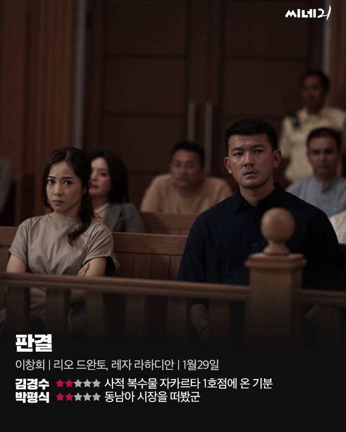 법원 경위 라카(리오 드완토)와 변호사 시험에 합격한 그의 아내 니나는 특급 호텔에서 축하 만찬을 즐긴다. 사실 그 만찬은 호텔 주인이 자신이 연루된 부패한 재판에 관해 입막음하려고 라카에게 건넨 식사권으로 이뤄진 것이었다. 니나는 그 진실을 알고 난 후 라카와 싸운다. 그날 밤 니나는 화장실에서 상류층 자제 디카(엘랑 엘 기브란)에게 묻지마 살인을 당한다. 변호사 티모는 화려한 언변으로 디카의 무죄를 입증하려고 한다. 라카는 상황을 뒤집으려 법정에서 인질극을 벌이는 강수를 둔다. <판결>은 넷플릭스 드라마 <살인자ㅇ난감>의 이창희 감독이 인도네시아와 합작해 제작한 영화다. 한국 관객에게 익숙한 사적 복수물 공식과 클리셰를 충실히 따른다. 시도 자체는 눈여겨볼 만하나 현지 배우가 연기하는데도 한국영화를 보는 듯하다는 기시감이 들며 만듦새 또한 허술하다.