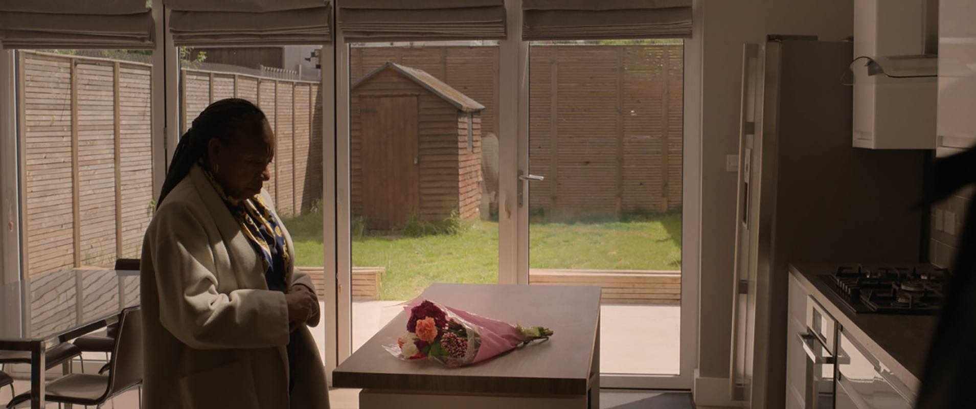 꽃병을 내려다보던 커틀리가 꽃다발을 집어들어 마당쪽으로 걸어가 던져버린다. 그리고 창문을 닫는다. 이 몸짓이 단지 아내에게 쏟아내는 노여움으로 보이지 않는 건, 그의 얼굴에 팬 심연과 그가 견지하는 느린 호흡 때문일까. 아내가 가까스로 힘을 내 바깥으로 열어낸 문을 남편이 다시 안으로 걸어 잠근다. 무뚝뚝한 아들이 가까스로 용기를 내 엄마에게 준 꽃을, 엄마가 아들의 마음에 가까스로 화답하며 화병에 꽂아둔 꽃을, 그가 집 바깥으로 내던진다. 아내의 귀한 액션의 가능성을 남편의 리액션이 폐쇄한다. 아내가 일으킨 작은 변화를 원점으로 돌리는 남편의 과격한 행동이 정작 아내가 보지 않는 곳에서, 아내 모르게 일어난다는 사실이 이 장면에 고독을 더한다. 저항과 체념, 분노와 슬픔 사이 어딘가에 놓일 이 기이한 반응의 이유에 영화는 섣불리 다가가지 않고 어둠이 내릴 때까지 그가 부엌에서 홀로 감내하는 시간에 한참이나 머문다. 마이크 리는 그 시간을 존중하기로 한다. 팬지의 행동으로 시작하지만 커틀리의 마음으로 끝나므로, 이 시퀀스만큼은 커틀리의 존재감이 깊이 새겨진 커틀리의 것이라고 우리의 연민은 어느새 그에게로 향한다. 어렵게 열린 문을 미련 없이 닫아버린 이 남자가 이내 치르게 될 대가를 미처 알지 못한 채로.