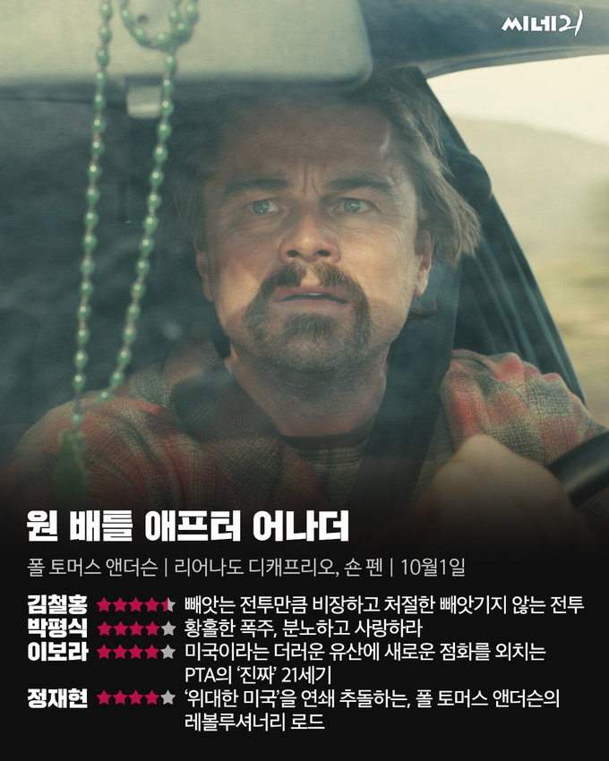 무엇보다 <원 배틀 애프터 어나더>는 양손 모두로부터 더러움을 물려받은 자의 자기 투쟁에 관한 영화이기도 하다. 궁극적으로는 가장 어린 사람이 이 끔찍한 상속을 어떻게 타개할 것인지, 그리고 어른은 그에게 어떤 양보와 신뢰를 보여줄 수 있을지를 고민하는 영화로 보인다. 누구 하나 흠집 없는 연기를 선보이며 완성된 앙상블을 보이며, 장르적으로는 심각한 추격 스릴러에 머물지 않고 코미디로서도 미덕을 발휘한다.