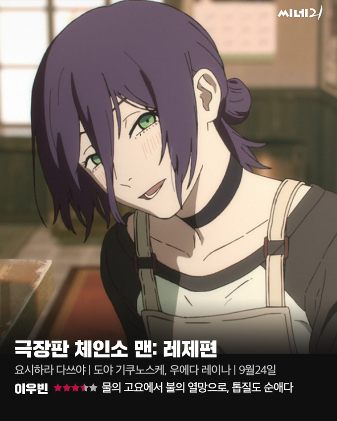 소년 덴지는 전기톱의 악마와 계약한 후, 모든 것을 썰어버리는 막강한 힘의 ‘체인소 맨’으로 다시 태어났다. 이후 일본 공안 소속의 데블 헌터가 되어 각종 악마와 맞서 싸우고 있다. 한편 상사 마키마를 흠모하는 덴지는 자신에게 진정한 마음이랄 게 있는지 고민하는 중이기도 하다. 여기엔 제대로 된 사회의 보살핌 없이 자란 덴지의 성장배경이 뒷받침되어 있다. 그런 덴지에게 불현듯 찾아온 또 한명의 소녀, 보랏빛 머리칼과 신묘한 눈망울을 지닌 레제. 덴지는 자신에게 호감을 보이는 레제와 함께 설레는 시간을 보내지만, 뜻밖의 악마와 마주치며 잠깐의 사랑을 멈추고 결투를 시작한다. 동명의 인기 만화 중 한 에피소드를 극장판으로 만든 작품이다. TVA에서 명확히 살아나지 못했던 원작의 허무하고 충동적인 정서가 훨씬 더 잘 어우러지는 모양새를 보여준다. 일반적이지 않고 어디로 튈지 알 수 없는 덴지의 성격이 비약 없이 자연스레 드러나면서 <체인소 맨>만의 독특한 분위기를 형성한다. 가장 중요한 것은 역시 덴지와 레제의 관계 변화다. 고요한 물의 움직임으로 멜랑콜리에 젖은 로맨스를 구현하던 이들의 감정은 후반부에 쉴 새 없이 폭발하는 불꽃의 열망으로 가시화된다. 작품의 서정성을 유려하게 매만지며 선사하는 물과 불의 시각적 완급 조절에 홀린 듯 빠져들 수밖에 없다. 영화 <태풍클럽>속 물의 뉘앙스가 주는 적막함과 긴장감을 오마주했다는 원작자 후지모토 다쓰키의 의중이 적절히 구현된 대목이다. <체인소 맨>시리즈의 다른 이야기와 세세한 연관성이 적고, 극장판만의 기승전결도 뚜렷한 터라 시리즈에 입문하기로도 좋은 작품이다.
