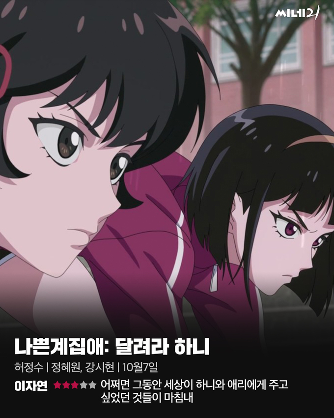 주인공 아닌, 그 옆에 있던 조연은 시간이 지나 어떻게 살고 있을까. 작품 바깥을 상상하는 건 언제나 즐거운 법이다. <나쁜계집애: 달려라 하니>는 원작 팬들에게 추억의 시간을 선물하듯 새로운 관점의 이야기를 선사한다. 오직 하니의 라이벌로 기능하던 나애리를 주인공으로 내세운 것. 이제 고등학생이 된 두 사람은 보다 고차원의 주제로 싸운다. 특히 길거리 위를 달린다는 ‘에스런’ 경기를 새롭게 창조하면서 다채로운 액션, 경기를 긴장감 넘치게 만드는 변수, 하니와 애리가 균형을 이뤄야만 하는 개연성 등을 지혜롭게 보완했다. 중간중간 유아동 애니메이션으로 전환되는 장면이 아쉬움을 남기지만 후반부 경기가 많은 것을 상쇄하기 충분하다. 노브레인 황현성이 음악감독을 맡아 스포츠물의 벅차오름을 고양시킨다.