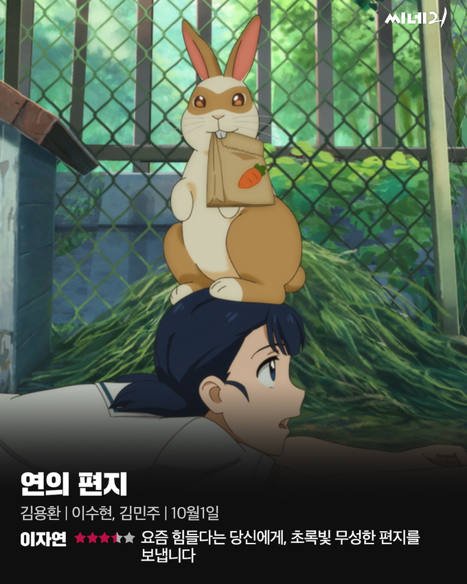 대중적인 사랑을 받은 네이버웹툰 <연의 편지>가 장편애니메이션으로 돌아온다. 악동뮤지션 이수현의 더빙으로 화제가 되었던 영화는 아름다운 작화와 음악으로 중무장했다. 과거 아픈 기억으로부터 벗어나기 위해 할머니 댁 근처로 전학 온 소리(이수현). 하지만 과거의 힘이 너무 센 탓일까. 새 학교에 적응하기도 쉽지 않다. 외로움과 고립감으로 매몰될 즈음 소리는 비밀스러운 편지 한통을 발견한다. “다음 편지를 찾기 위해선 이곳으로 가봐!” 학교 곳곳에 숨겨진 편지를 하나씩 발견할 때마다 벌어지는 동화적인 장면은 일종의 교내 어드벤처처럼 느껴진다. 무엇보다 <연의 편지>가 그리는 10대 아이들은 순진무구하게 행운에 기대기보다 제 손으로 다음 챕터를 여는 자력을 지녔다. 특히 이수현이 부른 메인 O.S.T <연의 편지>가 청량함을 고조시킨다.