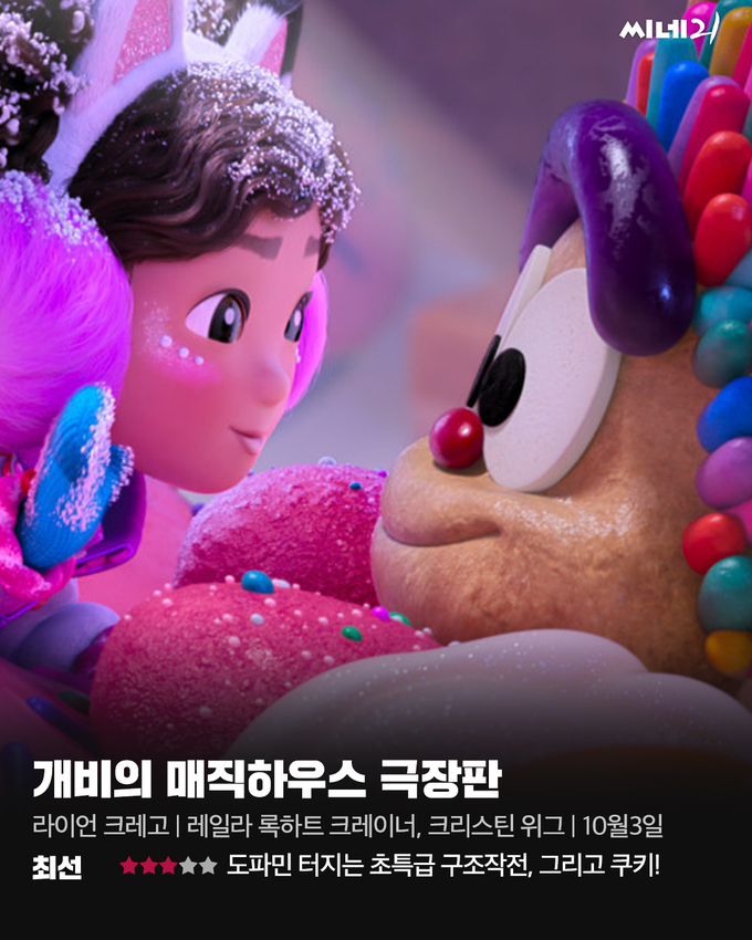 매직하우스와 냥이 친구들을 되찾기 위한 개비(레일라 록하트 크레이너)의 초특급 구조 작전! 긍정 소녀 개비는 매직하우스를 훔쳐간 괴짜 수집가를 쫓아 상상과 현실을 넘나들며 신나는 모험을 펼친다. 귀여운 비주얼의 친구들과 힘을 합쳐 위기를 헤쳐나가는 개비의 하루는 아슬아슬한 재미와 맛있는 웃음, 따뜻한 우정으로 가득하다. 드림웍스 애니메이션 <개비의 매직하우스 극장판>은 반짝이는 색감과 톡톡 튀는 연출로 아이는 물론 노는 법을 잊은 어른들까지 빠져들게 만든다. 특히 블랙핑크 로제가 부른 <APT.>와 영화의 대미를 장식하는 에스파의 엔딩곡 를 듣는 즐거움도 커서 컬러 도파민과 함께 뮤직 도파민이 팡팡 터진다. 엔딩크레딧엔 쿠키영상이 숨겨져 있어 재미와 설렘이 끝까지 이어진다. 고양이를 사랑하는 관객이라면 더욱 행복한 시간을 보낼 수 있다. 개비와 함께 너의 색깔을 밝혀봐!