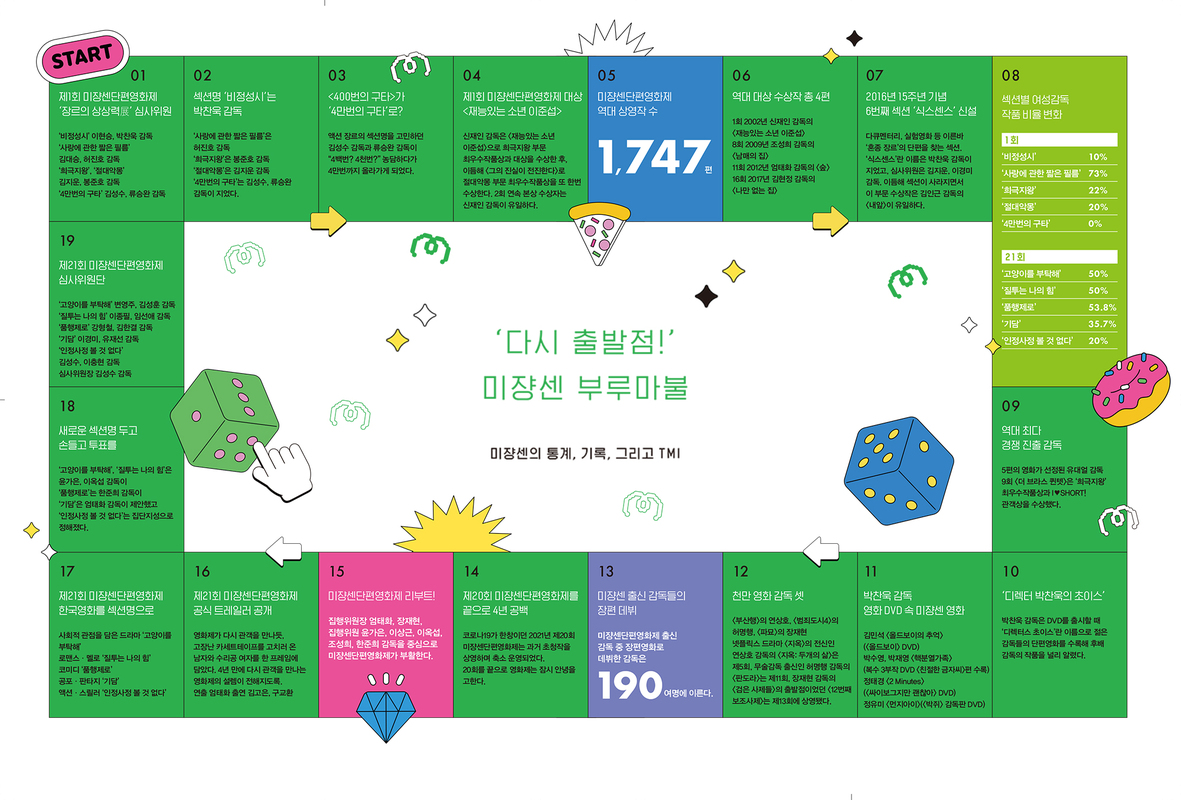 미쟝센영화제는 지난 20여년간 수많은 감독과 배우들이 직접 영화를 선정하고 시상해왔다. 그 덕분에 새로운 신인감독을 계속해서 배출해낼 수 있었고, 또 관객들이 단편영화에 가까워질 수 있는 장을 마련했다. 미쟝센의 역사를 여러 통계와 기록, 사소한 정보를 중심으로 재구성해봤다.