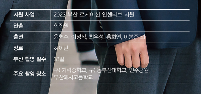정희(홍화연)가 이토록 자신감 있는 표정을 짓고 있는 건 오늘이 달라진 모습을 친구들에게 처음 보여주는 날이기 때문이다. 늘 안경을 쓰고 머리를 질끈 묶고 다니던 모범생이 세련된 모습으로 유세장에 나타나자 주변에서는 환호성이 터져나왔다. 학교물을 촬영할 때는 언제나 시간과의 싸움이다. 정규 수업 중에는 촬영이 불가능하니 방학 기간을 이용해 압축적으로 일정을 소화해야 했다. “그럼에도 시간을 조금이라도 더 확보할 수 있었던 건 주말에 학교 문을 열어주셨기 때문이다. 모두 부산영상위원회의 적극적인 협조 덕분이다. 다시 한번 감사드린다.”(송준 프로듀서) 빠듯한 일정 탓에 누구 하나 제대로 된 부산 나들이를 즐길 여유는 없었지만 제작진 모두는 부산 바다를 가슴 가득 품고 돌아올 수 있었다. 숙소 창 너머로 펼쳐진 오션뷰 덕분이었다. “창밖 너머로 드넓은 바다를 멍하니 바라보며 지친 몸과 마음을 치유할 수 있었다.”(한진원 감독) 바다와 학교, 그리고 청춘의 순간이 교차하던 부산 촬영. 그 묘미는 화면 너머에서도 그대로 전해질 것이다.