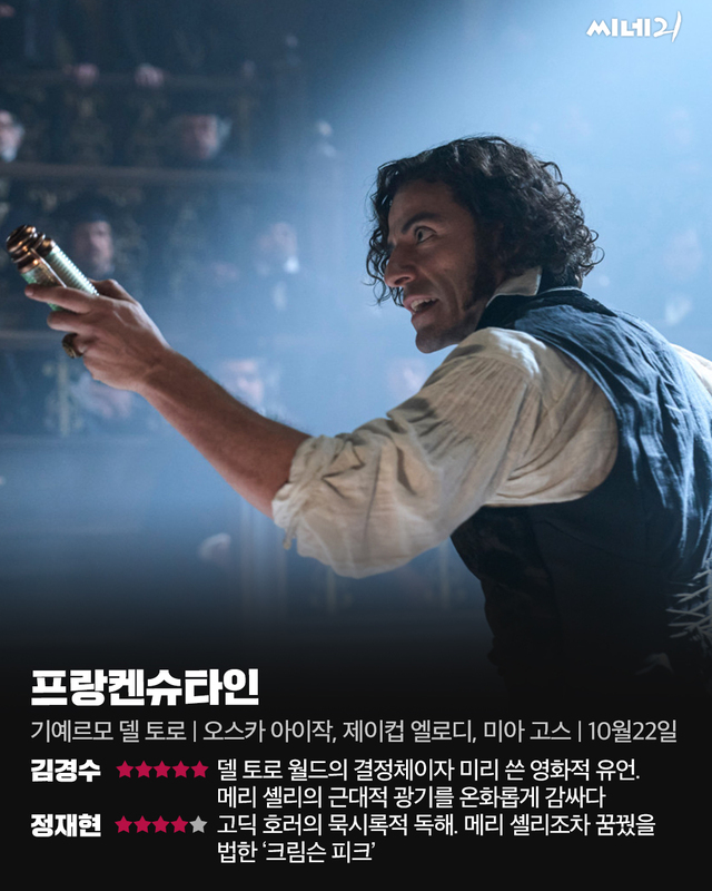 생과 사의 경계를 부수어 스스로 신이 되려는 자. 빅터 프랑켄슈타인(오스카 아이작)은 피조물(제이콥 엘로디)을 탄생시킨다. 하지만 빅터는 피조물에 금세 싫증을 느끼고, 피조물은 원치 않았던 탄생에 이어 자신을 멋대로 파괴하려는 창조주에게 분노한다. <판의 미로: 오필리아와 세개의 열쇠><셰이프 오브 워터: 사랑의 모양>등으로 괴수영화의 새 지평을 연 기예르모 델 토로가 마침내 필생의 역작을 만들었다. 처음으로 괴물에의 매혹을 느끼게 만든 작품이자 평생 그의 ‘차기작’이었던 <프랑켄슈타인>을 오랜 도전 끝에 1억2천만달러의 예산을 들여 세상에 내놓은 것이다. 프란시스코 고야나 오딜롱 르동의 화풍이 작품의 프로덕션디자인을 휘황하게 수놓고, 알렉상드르 데스플라의 바로크풍 스코어가 전면에 나서서 들끓는 정념을 고양한다. 감독의 숙원만큼 시각과 청각의 압도적인 물량 공세를 펼치는 작품이므로 극장 관람이 필수라 해도 과언이 아니다.