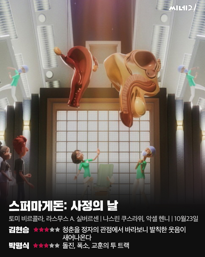 평범한 10대 소년 옌스. 그에게도 마침내 어른이 될 수 있는 역사적 순간이 찾아온다. 갑작스레 예고된 첫 경험에 옌스의 몸속 정자들은 잉태의 축복을 향한 막바지 훈련에 돌입한다. 과열된 경쟁 속에서도 너드 주인을 꼭 닮은 정자 시멘은 수정에 별다른 의욕을 보이지 않는다. 포근한 ‘알’ 속에 영원히 머물고 싶던 시멘은 동료를 설득하던 중 6억분의 1 확률의 생존 레이스에 강제로 휘말리게 된다. <스퍼마게돈: 사정의 날>은 청소년기의 성적 호기심과 육체적 사랑을 코믹하게 풀어낸 뮤지컬 애니메이션이다. 어리숙한 풋사랑이 빚어낸 우스꽝스러운 실수들이 영화 <소시지 파티>를 연상시키는 과감한 수위와 맞물리며 발칙한 웃음을 자아낸다. 다만 성과 사랑에 관한 진지한 성찰을 의도적으로 비껴간 점은 아쉬움을 남긴다. 제28회 부천국제판타스틱영화제 ‘매드 맥스’ 섹션 상영작.