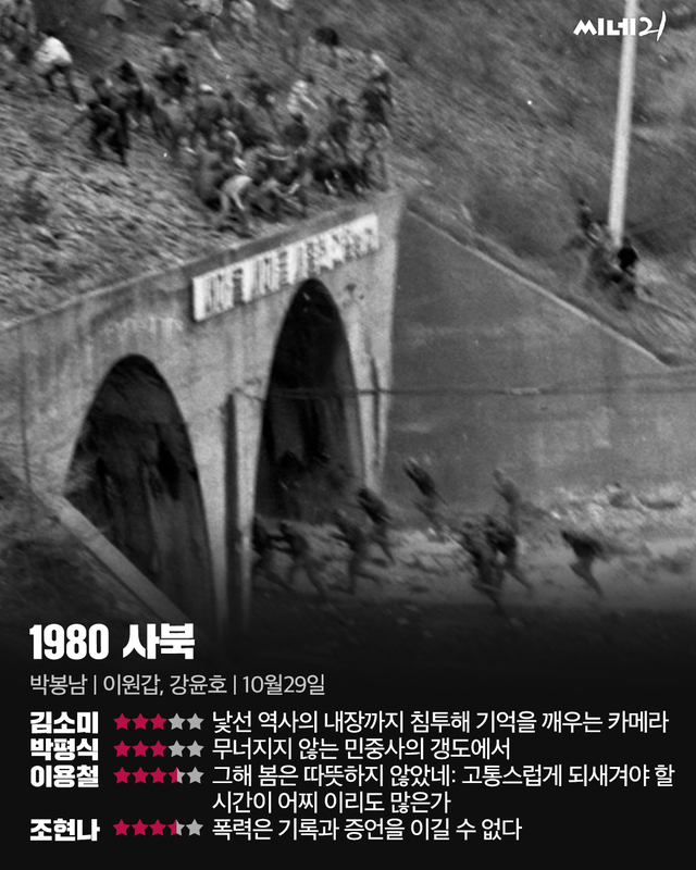 “사북에서 나만 탈출했다.” <1980 사북>은 혼자 살아남았다는 한 남자의 죄책감 서린 목소리로 열린다. 1980년 4월, 저임금 착취와 어용노조의 폐해에 맞선 사북의 광부들이 항쟁을 벌였다. 유혈 사태는 노동자, 경찰, 노조원의 가족까지 폭력의 가담자와 피해자를 뒤섞어놓았다. 계엄군 투입 직전 사태는 일단락되었으나, 이후 시위에 참여한 광부들이 체포·고문을 당하는 과정에서 사북항쟁의 트라우마는 짙어졌다. 영화는 시대의 야만을 단순히 고발하는 데 그치지 않고 생존자들의 엇갈리는 증언을 모자이크해 이 혼란을 기록하려 한다. 100여명 이상을 인터뷰하고 방대한 아카이브를 수집해 국가 폭력이 공동체를 와해하는 과정을 담은 다큐멘터리가 오늘날 되풀이된 풍경에도 닿는다. 다중의 진실과 슬픔이 맺힌, 그러나 잊혀진 역사를 들여다보는 카메라의 시선이 곧 <1980 사북>의 윤리다.