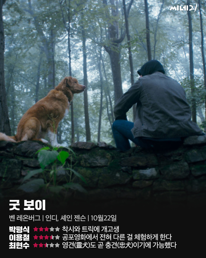 흔히 고양이를 영험한 동물로 꼽지만, 충실한 강아지 인디도 어느 날부턴가 불길한 기운을 느끼기 시작한다. 주인 토드(셰인 젠슨)의 건강 악화가 빠르게 진행되면서 그의 곁에 의문스러운 현상이 발생한 것이다. 피를 토하고 병원에 실려간 토드는 무슨 일인지 퇴원 직후 돌아가신 할아버지의 낡은 별장으로 향한다. 외진 숲속에서 자신의 눈에 아른거리는 흉측한 형상으로부터 인디는 토드를 지키기 위해 노력한다. 벤 리언버그의 <굿 보이>는 견생의 시점에서 전개되는 호러영화다. 이따금 허공을 향해 짖는 반려견의 행동이 마치 인간이 인지하지 못하는 서늘함을 포착하는 듯 풀어낸 영화의 발상이 인상적이다. 다만 견생이 마주할 실질적 공포를 묘사하기보단 주인을 위한 충직만으로 반복되는 서사는 과감한 시도에 비해 얄팍하게 다가온다. 그럼에도 명견 인디의 호연을 바라보는 즐거움이 있다.