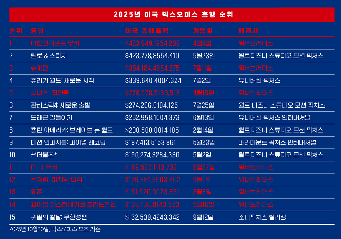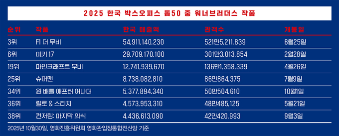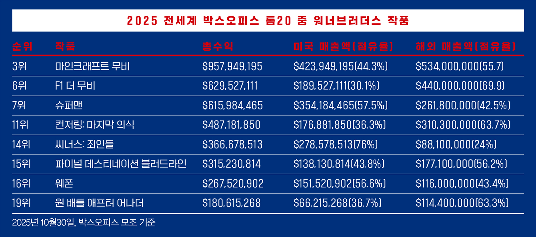 <마인크래프트 무비>의 압도적 흥행. 자국보다 해외 흥행이 더 강세였던 <F1 더 무비>가 올해 워너브러더스의 황금 거위로 자리매김해 스튜디오가 <원 배틀 애프터 어나더>의 손실 앞에 ‘영화적 성취’라는 훈장을 달 수 있게 해줬다.