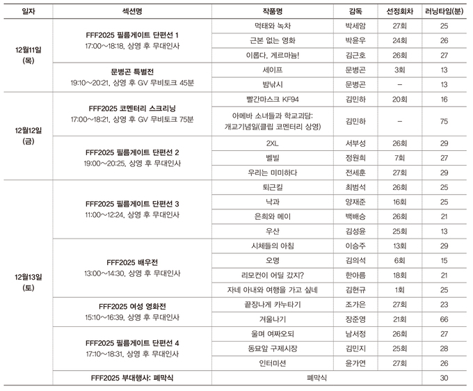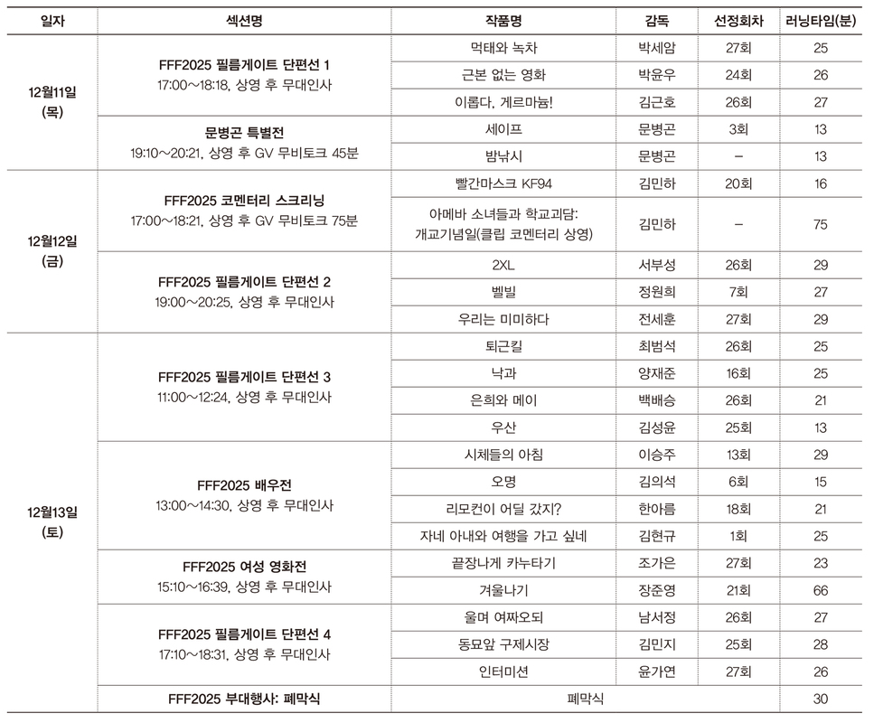 제27회 제작지원작 4편은 상실과 거리감, 회복과 소통의 정서를 공유한다. 조가은 감독의 <끝장나게 카누타기>는 두 인물간의 교감을 중심으로 감정의 리듬을 정제된 방식으로 포착해 잔잔한 여운을 선사하고, 박세암 감독의 <먹태와 녹차>는 낯선 만남 속 인물들의 관계를 세밀하게 그려내며 서정적 깊이를 더한다. 윤가연 감독의 <인터미션>은 잠시 멈춘 가족의 시간이 다시 흐르는 순간을 따뜻하게 전하는 작품이고, 전세훈 감독의 <우리는 미미하다>는 상징주의적 코즈믹호러 형식을 통해 사회적 함의를 우화적으로 결합한 실험적 단편이다. 제26회 제작지원작 5편은 다채로운 상상력이 돋보이는 작품으로 채워져 있다. 서부성 감독의 <2XL>은 영화 현장의 일상을 재해석한 작품이고, 백배승 감독의 <은희와 메이>는 삼신할머니 설화를 현대적으로 해석해 현실과 판타지의 세계를 유쾌하게 연결한다. 김근호 감독의 <이롭다, 게르 마늄!>이나 최범석 감독의 <퇴근킬>은 날카로운 유머 감각이 돋보이는 영화다. 남서정 감독의 <울며 여짜오되>는 한 가족의 다층적 삶에서 연출의 섬세한 시선을 느낄 수 있다. 한편 필름 게이트 영화제는 2013년 필름게이트 제작지원 작이었던 문병곤 감독의 <세이프>가 칸영화제에서 한국 최초로 단편부문 최고상인 황금종려 상을 받은 해에 첫선을 보였다. 올해 영화제에선 <세이프>를 포함해 지난해 개봉한 문병곤 감독의 <밤낚시>를 다시 볼 수 있다. 또한 제29회 부천국제판타스틱영화제에서 코리안 판타스틱 장편부문에서 작품상을 수상한 김민하 감독 또한 필름게이트 출신이다. 지난해 공개돼 마니 아층의 열광을 이끌어낸 <아메바 소녀들과 학교괴담: 개교기념일>의 코멘터리 상영과 제20 회 제작지원작 <빨간 마스크 KF94>가 연이어 상영되는 회차 또한 주목해보자.
