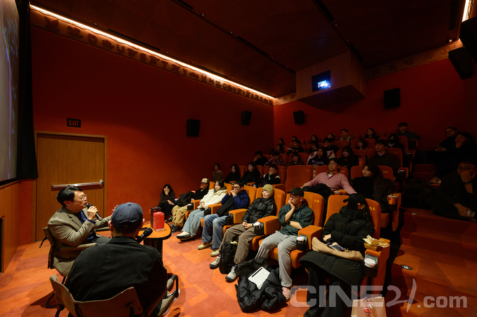12월12일 금요일 오후 7시30분. 3년 전 개봉한 영화를 보기 위해 이날, 이 시간, 이 동네를 찾은 사람들은 저마다 어떤 마음의 여정을 거쳐 극장에 앉아 있을까. ‘필름 블렌딩 카페’ 상영 프로그램의 포문을연 <애프터 양>은 한국계 미국인 감독 코고나다의 두 번째 장편영화로, 2022년 당시 제23회 전주국제영화제 개막작으로 선정되기도 했다. 백인 아버지, 흑인 어머니, 그리고 입양된 아시아인 딸과 안드로이드 로봇 ‘양’(저스틴 H. 민)으로 구성된 가족이 주인공이다. 영화는 이들의 이야기를 통해 비인간 존재와 맺는 관계, 그리고 함께 쌓아 올린 기억의 정체를 추적하며 인간의 조건에 대해 다시금 묻는다. 이 작품을 ‘나를 돌아보는 영화’로 추천한 송경원 <씨네21> 편집장이 모춘 무비랜드 극장주, 그리고 30명의 관객과 마주 앉았다. 유난히 아담한 극장 규모 덕분에 말하는 이와 듣는 이 사이의 거리는 그 어느 GV 때보다도 가깝게 느껴졌다.