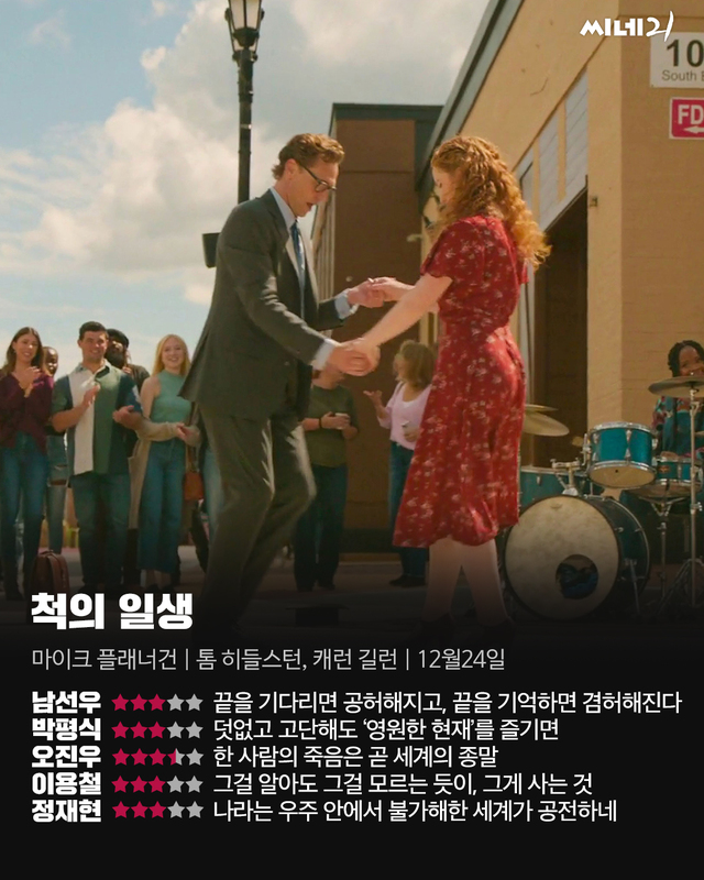 감독은 <제럴드의 게임> <닥터 슬립>을 차례로 만든 데다 <캐리>를 TV시리즈로 리메이크한다는 계획을 발표해 스티븐 킹 소설의 영상화의 선두 주자로 자리매김한 마이크 플래너건이 맡았다. <오큘러스> <위자: 저주의 시작> 등이 포진한 초기 필모그래피에서부터 호러를 베이스로 하되 섬세한 드라마를 연출하는 능력을 선보인 그는 기이함과 따뜻함이 공존하는 <척의 일생>을 매끄러운 필 굿 무비로 매듭지었다. 지구 멸망의 이미지로 출발해 한 인간의 내면에 도착하는 이 영화는 “나는 거대하며 수많은 것을 품고 있다”고 긍정하는 월트 휘트먼의 시를 닮았다. 극에서 중요한 몫을 다하는 이 시구처럼, <척의 일생>은 한 사람이 품은 우주를 존중한다. 끝이 있기에 아름다워지는 그 완결성이 어쩐지 연말 극장가에도 잘 어울린다.