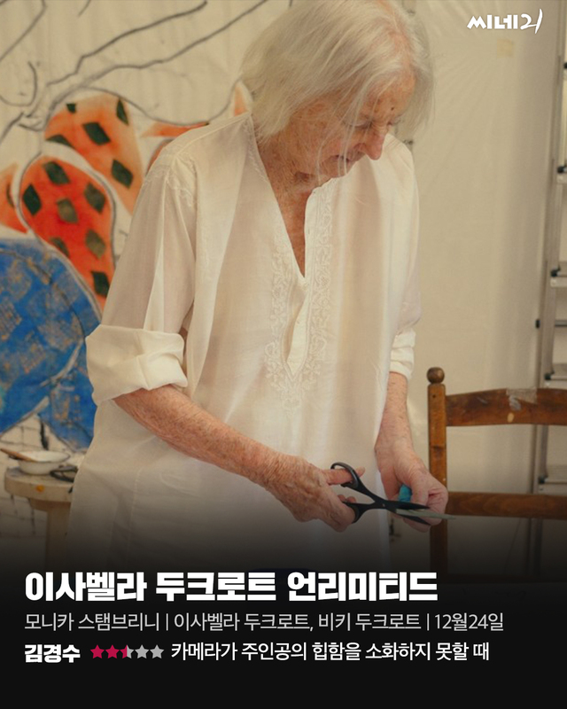 90살의 무명 화가 이사벨라 두크로트에게 기적이 찾아온다. 그녀의 그림이 갤러리스트 기젤라 카피타인에게 발굴돼 바젤아트페어에 초대받은 것이다. 서랍 속 그림은 미술계의 주목을 받는 언리미티드에 소개되고 그날부터 이사벨라는 유명 화가가 된다. 사실 그녀는 미술학교를 다니지 않고 55살에 독학으로 그림을 시작한 늦깎이다. 왜 미술계는 이사벨라를 주목했으며, 그녀는 화가가 되기 전에 어떤 삶을 살았을까. <이사벨라 두크로트 언리미티드>는 예술가 이사벨라 두크로트를 탐구하는 다큐멘터리다. 인터뷰를 통해 그녀의 예술관과 작업 방식, “행복한 삶은 예순부터 시작한다”라는 철학을 투명하게 전달한다. 매력 넘치는 소재에 비해 완성도는 아쉽다. 우선 두크로트의 예술이 가진 의의와 미학을 조망하는 객관적인 자료가 부족하다. 그녀를 세련된 화가로 포장하려는 과장된 음악과 산만한 서사도 몰입감을 방해한다.