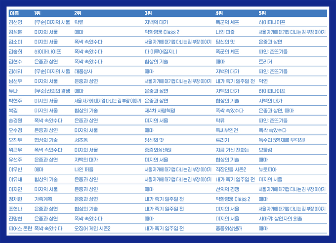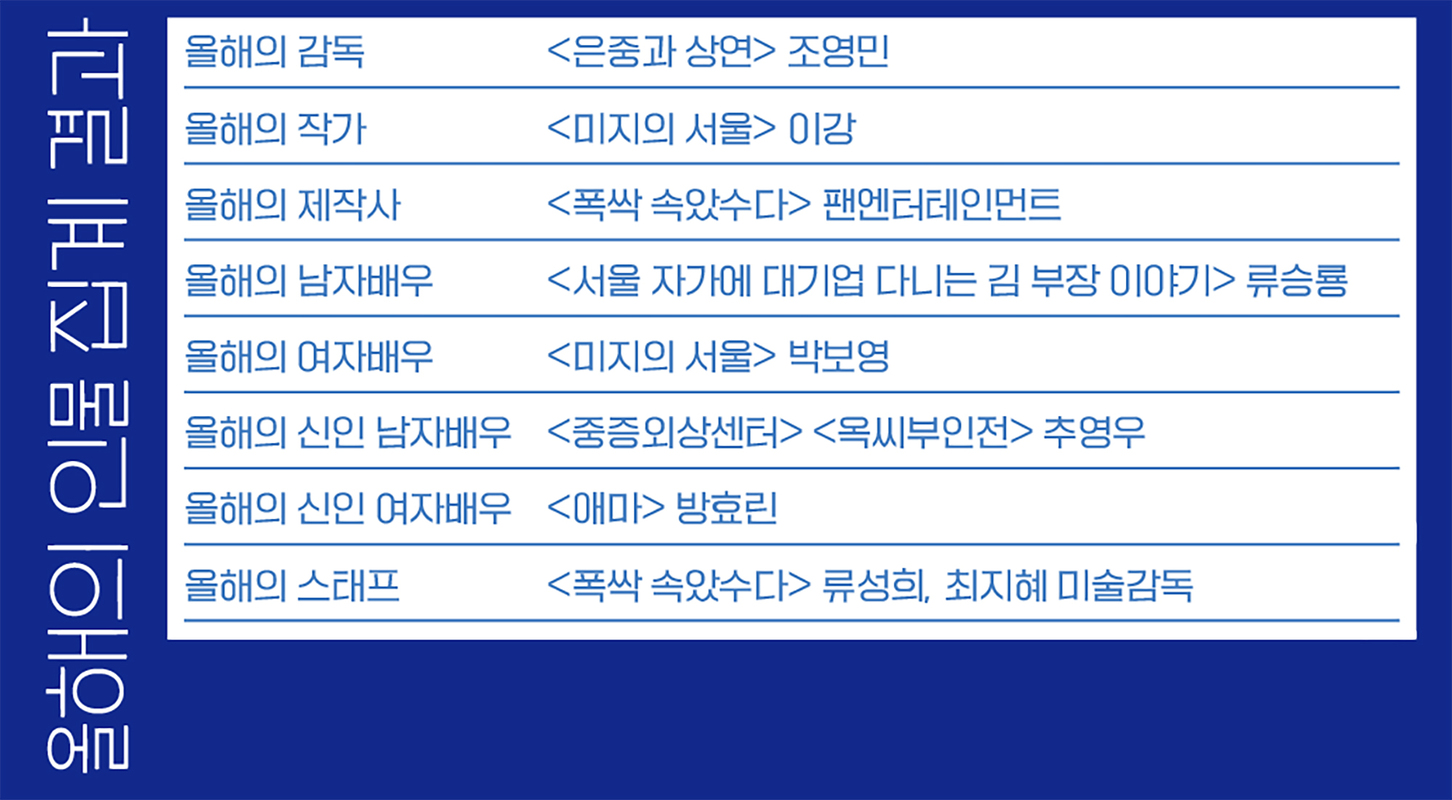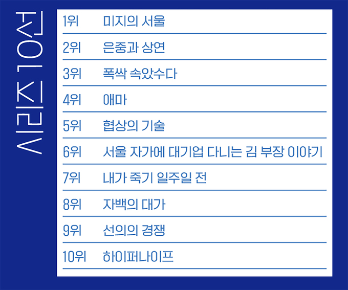 2025년은 스토리텔링의 저력이 다시금 도약하는 해였다. 최근 드라마 시장에서 웹툰·웹소설 IP를 응용한 시리즈가 강세를 보이는 가운데 오리지널 창작 드라마가 활로를 넓히며 흥행 성적과 화제성을 모두 거머쥐었다. 실제로 올해 <씨네21> 베스트 리스트에 올린 시리즈 5위까지가 모두 오리지널 창작 시리즈고, 특히 1, 3위를 차지한 <미지의 서울>과 <폭싹 속았수다>가 각각 3월과 5월로 상반기에 방영된 것을 감안하면 오리지널 스토리의 여운이 하반기까지 묵직하게 이어진 것을 알 수 있다. 올해는 22명의 영화평론가와 기자 그리고 TV비평가가 ‘시리즈’ 송년 베스트 설문에 참여했다. 선정 대상은 2024년 12월9일부터 2025년 12월8일까지 방영된 시리즈물로, 단막극도 포함했다. 해당 기간 내에 ‘마지막 회’가 방송됐느냐를 기준으로 삼았다(즉, 아직 종영하지 않은 <모범택시3>는 해당되지 않지만 2024년 11월30일부터 2025년 1월26일까지 방영된 <옥씨부인전>은 포함된다). 마지막으로 올해 시리즈 시장에서 드러나는 경향과 현황을 큼직한 질문으로 정리했다. 이 특집을 통해 2025년 시리즈 산업의 윤곽을 이해할 수 있길 바란다.