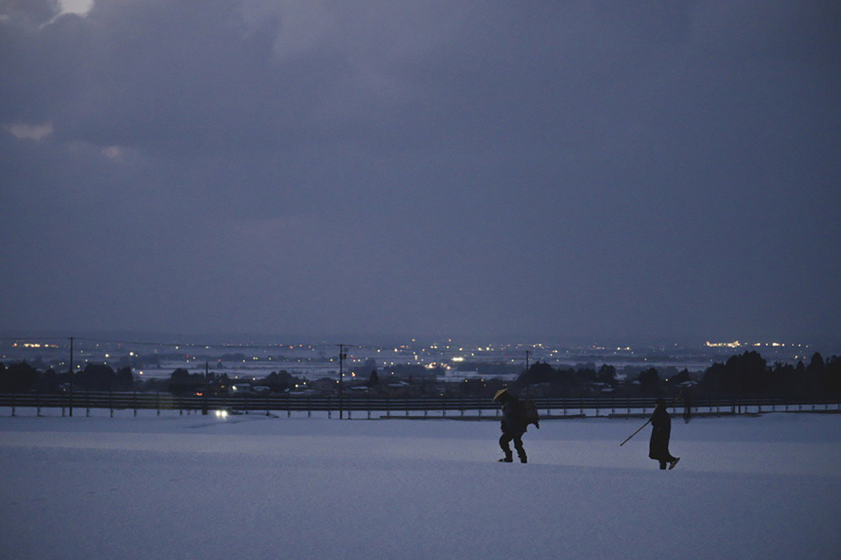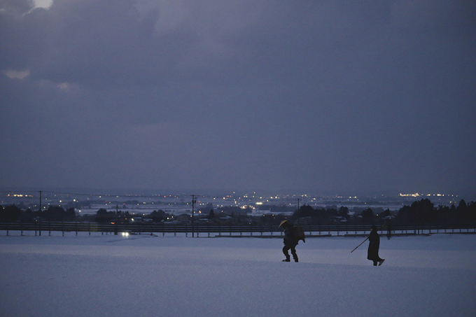 물론 이 영화의 프레임이 한 사람만을 위한 것일 리는 없다. 우리는 미야케 쇼의 전작들을 경유하며 그가 ‘사람의 관계성’을 무엇보다 중시하는 감독임을 잘 알고 있다. 그는 사람 사이의 물리적, 심리적 거리를 존중하고 탐색하는 일에서 장면을 구성하는 본질적인 질문을 발견해왔다. <여행과 나날>의 스탠더드 화면비에는 그러한 문제의식 또한 흥미롭게 녹아 있다. 요컨대 겨울 편에서 이와 여관 주인이 한밤, 눈밭의 즉흥적인 여정을 감행하는 대목을 눈여겨볼 만하다. 커다란 나무통을 짊어진 여관 주인이 등장해 걷기 시작하면, 얼마 지나지 않아 그물망을 어깨에 걸친 이가 뒤따라 나온다. 이 장면의 화면비는 설원의 너른 풍광보다는 어둠 속 희미한 불빛들을 배경으로 벌판을 천천히 가로지르는 두 사람의 형상을 위한 것이다. 이 세계의 폭은 발이 푹푹 빠지는 하얀 벌판에서 한 방향으로 함께 나아가는 두 사람의 리듬과 너무 멀지도 너무 가깝지도 않은 상태로 둘이 지속하는 거리를 보존하면서 장면에 절묘한 균형을 부여한다. 우리는 카메라가 붙잡은 투숏이 아니라, 세계에 조용히 발자국을 새기며 프레임을 통과하는 투숏을 마주한 기분에 젖는다. 이러한 인상은 이들의 귀갓길에도 반복된다. 두 사람의 여정은 소동으로 끝나지만, 그 발자국의 리듬과 거리, “우리가 눈 속을 걷고 있는 풍경을 멀리서 바라보면 어떨까요?”라는 이의 말처럼 그 광경을 조망해보는 상상이 결국 영화 후반, 이의 글감이 되었는지도 모른다. 백지 같은 눈밭에 흔적을 남기며 걸어가는 이의 뒷모습으로 <여행과 나날>이 끝날 때, ‘영화’는 여전히 진행 중인 것이다. 미야케 쇼는 영화로 순환하는 세계의 감각을 좇는다.