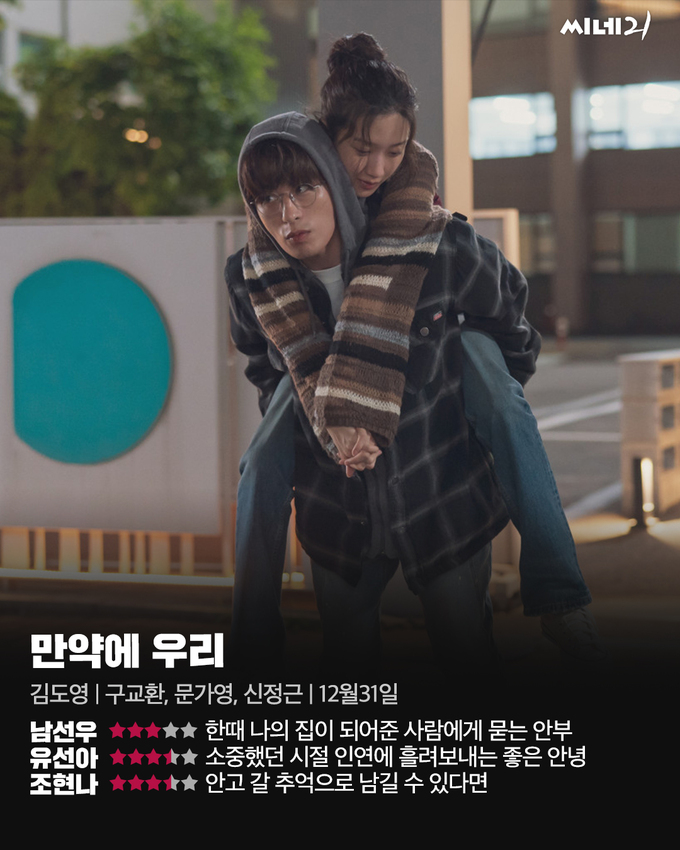 배우이자 연출자인 김도영 감독의 <만약에 우리>는 류뤄잉의 소설 <춘절, 귀가>를 원안으로 삼은 유약영 감독의 중국영화 <먼 훗날 우리>를 원작으로 한 리메이크작이다. 게임 개발을 하고 싶어 하는 은호와 건축사가 되어 집을 짓고자 하는 정원의 꿈이 아직 멀기만 했던 과거는 컬러로, 현재는 흑백으로 교차하는 설정은 원작과 동일하지만 <만약에 우리>의 각색이 두 연인의 이야기를 조금 더 섬세하게 다루고 있다. 과거와 현재의 교차점은 보다 자연스럽게 맞물려 이어지도록 다듬어졌고 실현되지 못하는 꿈과 생활고, 취업난이라는 현실의 벽에 맞부딪힌 연인의 마음이 어떻게 서로에게 소홀해지고 멀어져가는지가 구체화된 에피소드와 대사를 통해 현실감 있게 드러난다. 영화는 전반에서 로맨틱코미디, 후반에서 멜로드라마의 성격을 뚜렷하게 나누어 드러내는데 두 주연배우인 구교환과 문가영의 연기가 세월을 아우르기도 하는 이 전환에 자연스럽게 녹아든다. 무엇보다 로맨틱코미디 구간에서 과하지 않은 슬랩스틱과 애드리브를 허용하며 멜로드라마 구간에서 넘치지 않는 무게감의 균형을 일궈낸 김도영 감독의 세심한 연기 연출과 자연스러운 언어의 대사는 <만약에 우리>에서 가장 돋보이는 지점이다.