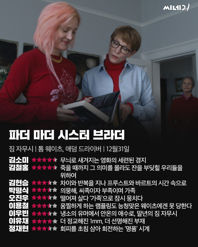 제프(애덤 드라이버)와 에밀리(마임 비아릭) 남매는 해마다 한번 아버지를 만나기 위해 한적한 시골 마을을 찾는다. 형식적인 덕담이 오가지만 따뜻한 가족 흉내는 오래가지 못하고 거실에는 곧 어색한 침묵만이 내려앉는다. 불편함을 견디지 못한 남매가 집을 나서자 그제야 아버지(톰 웨이츠)는 자신의 숨겨온 비밀을 드러내기 시작한다. 짐 자무시 감독의 신작 <파더 마더 시스터 브라더>는 파편화된 현대 가족의 풍경을 3부작 옴니버스 형식으로 풀어낸 작품이다. 각 장에서 미묘하게 변주되는 상황들을 조합해나가는 즐거움도 크지만, 무엇보다 나른한 일상의 작디작은 순간들 속에서 섬세한 감정을 길어올리는 거장의 특기가 단연 돋보인다. 생 로랑 프로덕션의 첫 베니스국제영화제 공식 경쟁부문 진출작이자 황금사자상 수상작이다.