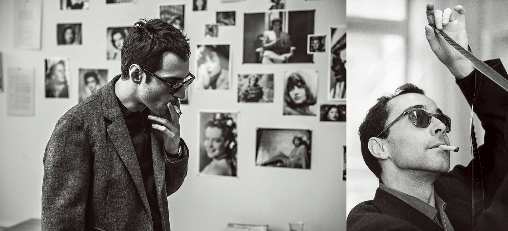 왼쪽은 <누벨바그> 속에서 장뤼크 고다르를 연기한 기욤 마르벡, 오른쪽은 실제 장뤼크 고다르 감독의 젊은 시절 모습이다. 리처드 링클레이터 감독은 기욤 마르벡이 외양뿐 아니라 고다르가 보여줬던 특유의 장난스러운 허세와 자신감마저 지니고 있었다고 말한 바 있다.
