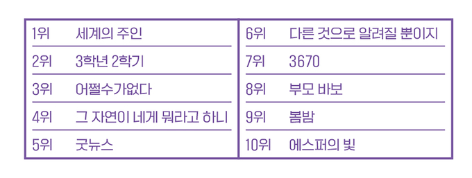 1위는 윤가은 감독의 <세계의 주인>에 돌아갔다. 세 번째 장편에 이르러 윤가은 감독은 성폭력 피해자를 중심으로 청소년 드라마를 정교히 빚어냈다. 그 세심함에 여러 필자가 찬사를 아끼지 않은 동시에 더 많은 논쟁이 요구되는 영화라는 점에 공감을 표했다. 2위 <3학년 2학기>는 이란희 감독이 <휴가>이후 4년 만에 내놓은 두 번째 장편이다. 공장의 현장실습생들을 다루되 사건, 사고 대신 사회초년생으로서 발을 내딛는 이들의 여정에 초점을 맞춰 호평받았다. 박찬욱 감독의 미감과 주제의식을 재확인할 수 있다는 평과 함께 <어쩔수가없다>가 3위에 호명됐고, 4위 <그 자연이 네게 뭐라고 하니>역시 홍상수 감독의 독창적인 세계가 여전히 건재함을 증명하는 기회였다. 5위 <굿뉴스>는 근래 가장 빠르게 차기작을 내놓는 감독 중 하나인 변성현의 영화로 <킹메이커>, <길복순>, <사마귀>(각본)에 이은 그의 작품 세계가 더욱 공고해졌음을 확인할 수 있었다.